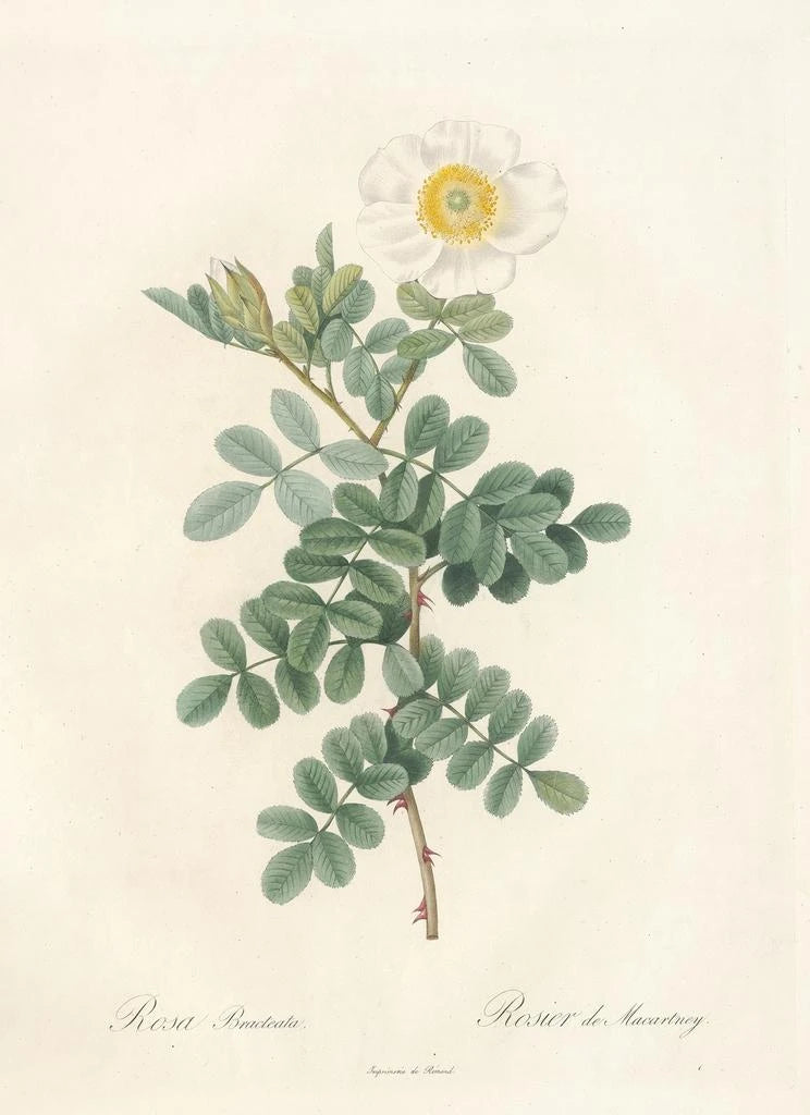 Pierre Joseph Redouté, nicknamed the "Raphael of flowers," is an iconic figure in botanical painting of the 18th century. Born in 1759 in Belgium, he settled in Paris where he became the court’s official flower painter. Influenced by neoclassical and romantic currents, Redouté specialized in the representation of plants and flowers with scientific precision. His works, including Rosa Bracteata, testify to his exceptional talent and attention to detail. He successfully combined art and science, contributing to the popularization of botanical studies in his time, while leaving a lasting legacy in the world of floral art.