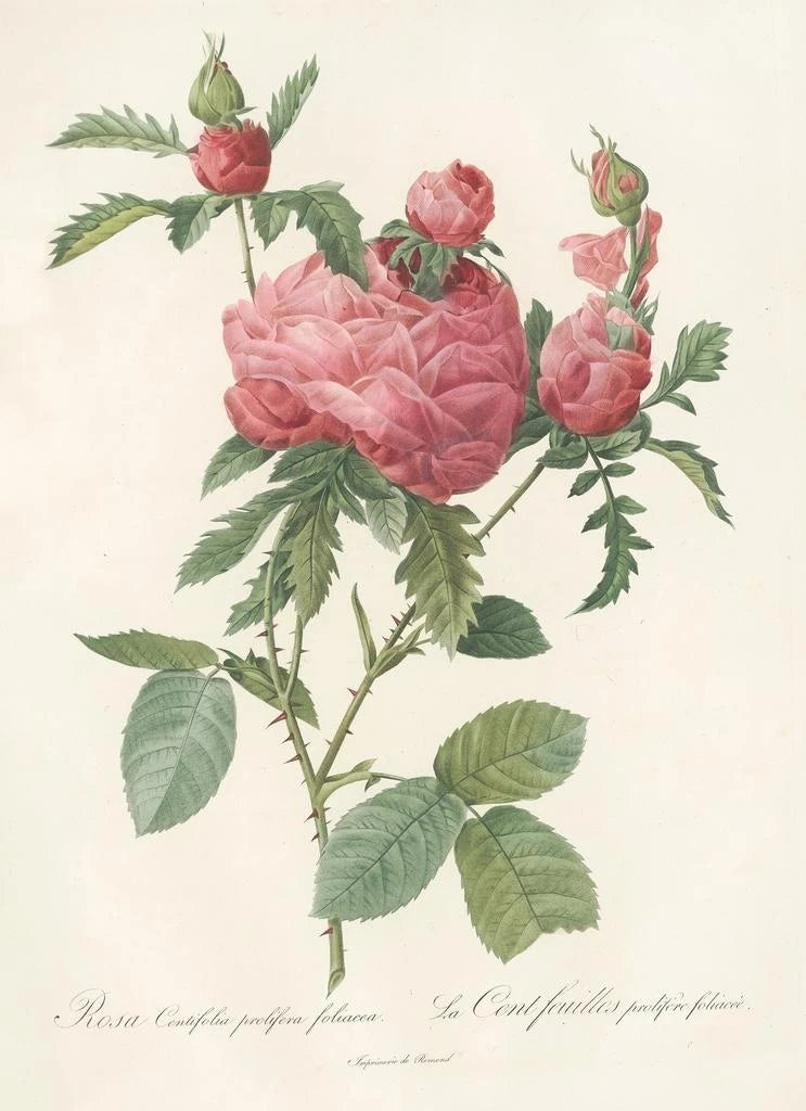 Pierre Joseph Redouté, nicknamed the "Raphael of flowers," was a Belgian painter and illustrator of the 18th century, renowned for his botanical representations of unparalleled accuracy. Influenced by the royal gardens of France, he captured the beauty of plants with such finesse that he became the official painter of Marie-Antoinette. Redouté played a key role in botanical illustration, blending art and science. His works, including "Rosa Centifolia Prolifera," reflect a time when botany was at the crossroads of aesthetics and scientific study, marking a turning point in floral art.