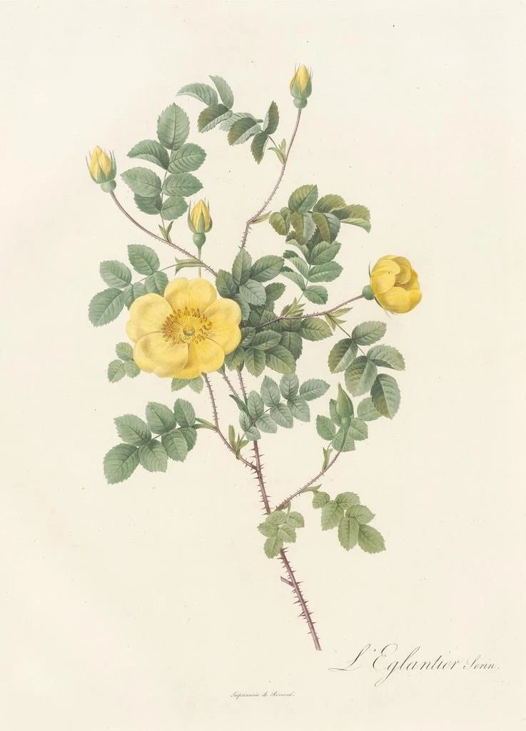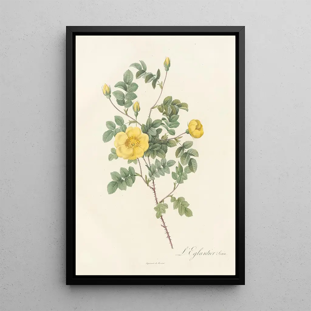The art print of Rosa Eglanteria Luteola immerses us in a world of softness and finesse. The yellow petals, delicately painted, seem to capture light in an almost magical way, creating a soothing atmosphere. The watercolor technique, mastered by Pierre Joseph Redouté, allows for the subtle nuances of the flower to be rendered with remarkable precision. Every detail, from the veins of the leaves to the delicate shadows, reflects a meticulous observation of nature. This artwork invites contemplation and discovery of the botanical wonders that surround us.