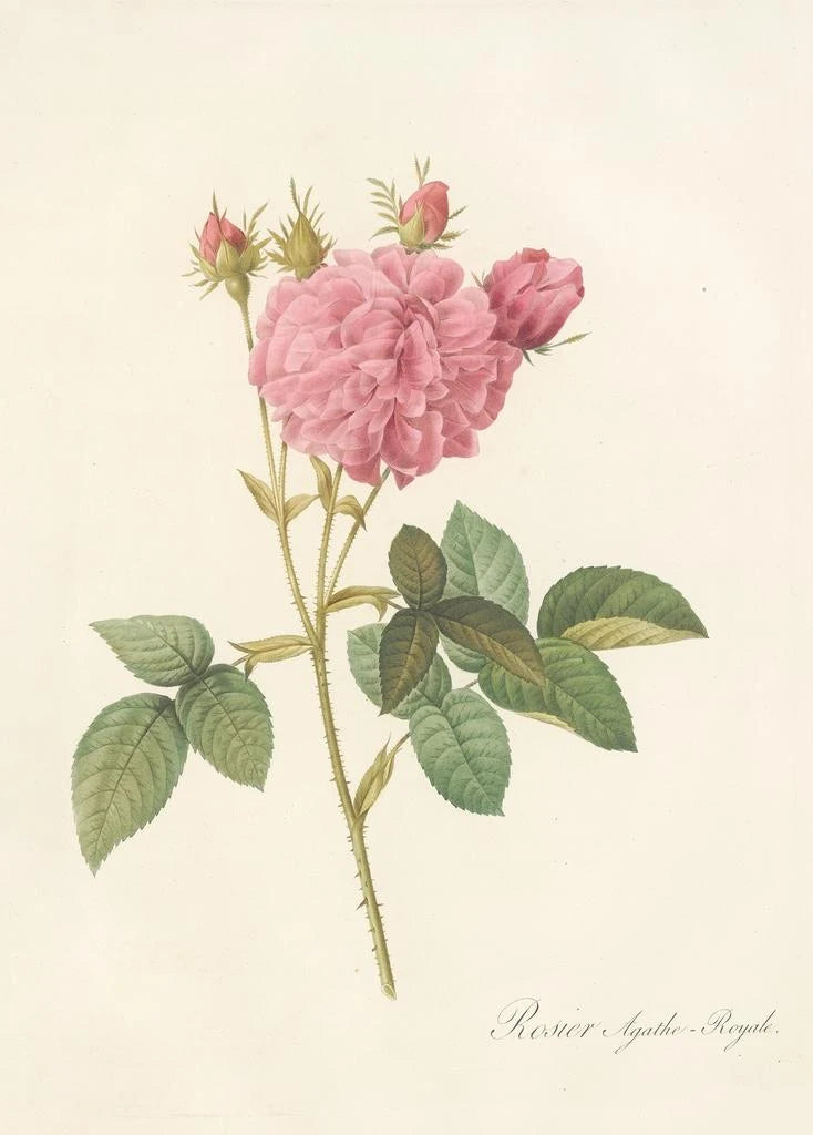 Pierre Joseph Redouté, born in 1759, is recognized as one of the greatest botanical illustrators of his time. Working at the French court, he skillfully combined art and science, paying tribute to the floral diversity of his era. His style, influenced by neoclassicism, is characterized by meticulous accuracy and aesthetic sensitivity. Redouté’s works, such as Rosa Gallica Agatha Var Regalis, are not only artistic representations but also references for botanists. His legacy endures, making him an essential figure in the world of floral art.