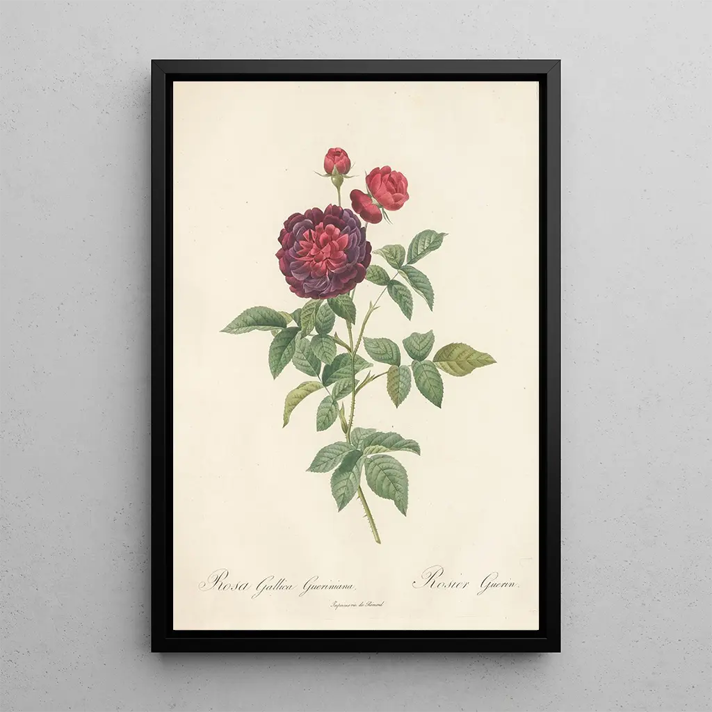 Pierre Joseph Redouté, born in 1759, is an iconic figure in floral art of the 18th century. Working at the French court, he was able to combine his love for botany with his artistic talent, becoming the official painter of flowers. His works, including Rosa Gallica Gueriniana, are the result of meticulous observation and a unique aesthetic sensitivity. Influenced by rococo and neoclassical styles, Redouté left a lasting legacy in the art world, celebrating the beauty of plants through illustrations that continue to inspire art and botany enthusiasts.