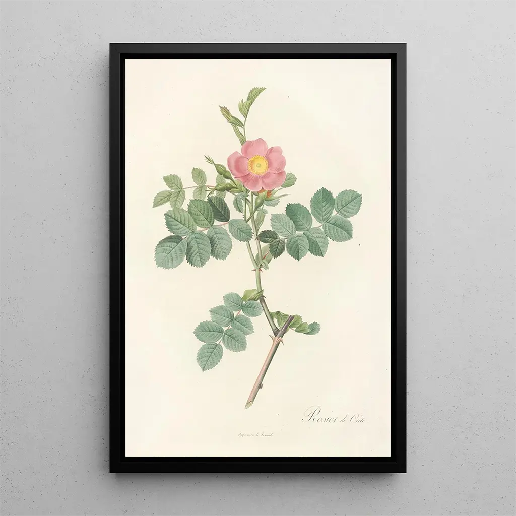 The art print of Rosa Rubiginosa Cretica transports us into a floral world where wild beauty blends with delicacy. The vibrant hues of the petals, ranging between pink and purple, are highlighted by a subtly nuanced background. The watercolor technique, used by Pierre Joseph Redouté, brings this piece to life, creating an atmosphere that is both gentle and dynamic. Every detail, from the leaves to the flowers, is rendered with precision that invites wonder and appreciation of nature.