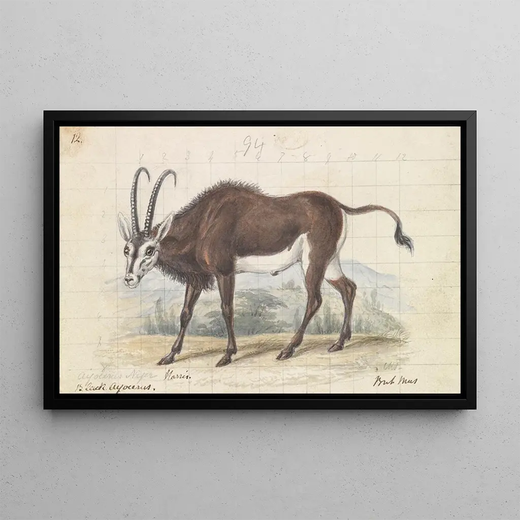 The artwork "Antilope sable" by Charles Hamilton Smith is a fascinating depiction of this majestic animal, where light plays on the nuances of its golden coat. The composition, both dynamic and harmonious, highlights the grace of the antelope in its natural habitat. The warm, earthy colors evoke the savannah, while the meticulous details of the fur and horns add striking depth to this art print. The overall atmosphere is imbued with a wild serenity, inviting the viewer to escape into a world where nature reigns supreme.