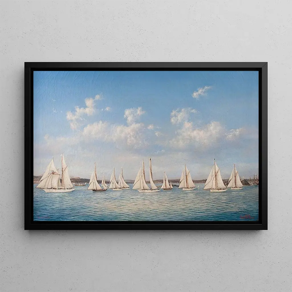 The canvas "Sailing Regatta" by Ludwig Rubelli von Sturmfest depicts a vibrant scene where white sails gracefully unfurl on shimmering waters. The vivid colors, ranging from deep blues to emerald greens, create a dynamic and lively atmosphere, almost tangible. The artist's technique, skillfully blending realism with an impressionist touch, allows viewers to feel the movement of the waves and the breath of the wind. Every detail, from the reflections on the water to the billowing sails, contributes to a harmonious composition that invites escape and contemplation.