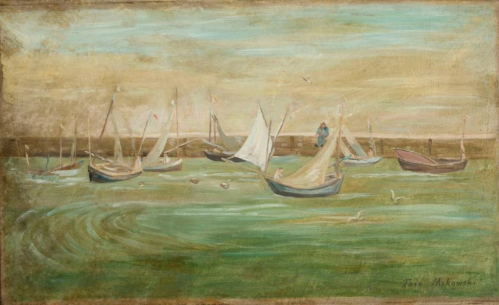 In this work by Tadeusz Makowski, the sailboats come to life, gliding gracefully over the calm waters. The vivid colors and stylized shapes evoke a joyful and dynamic atmosphere, where the movement of the sails seems almost tangible. Makowski, with his unique approach, manages to capture the very essence of navigation, blending abstraction and reality. Every element of the composition, from the sails to the reflections on the water, is carefully orchestrated to create a visual harmony that transports the viewer to an enchanting maritime world.