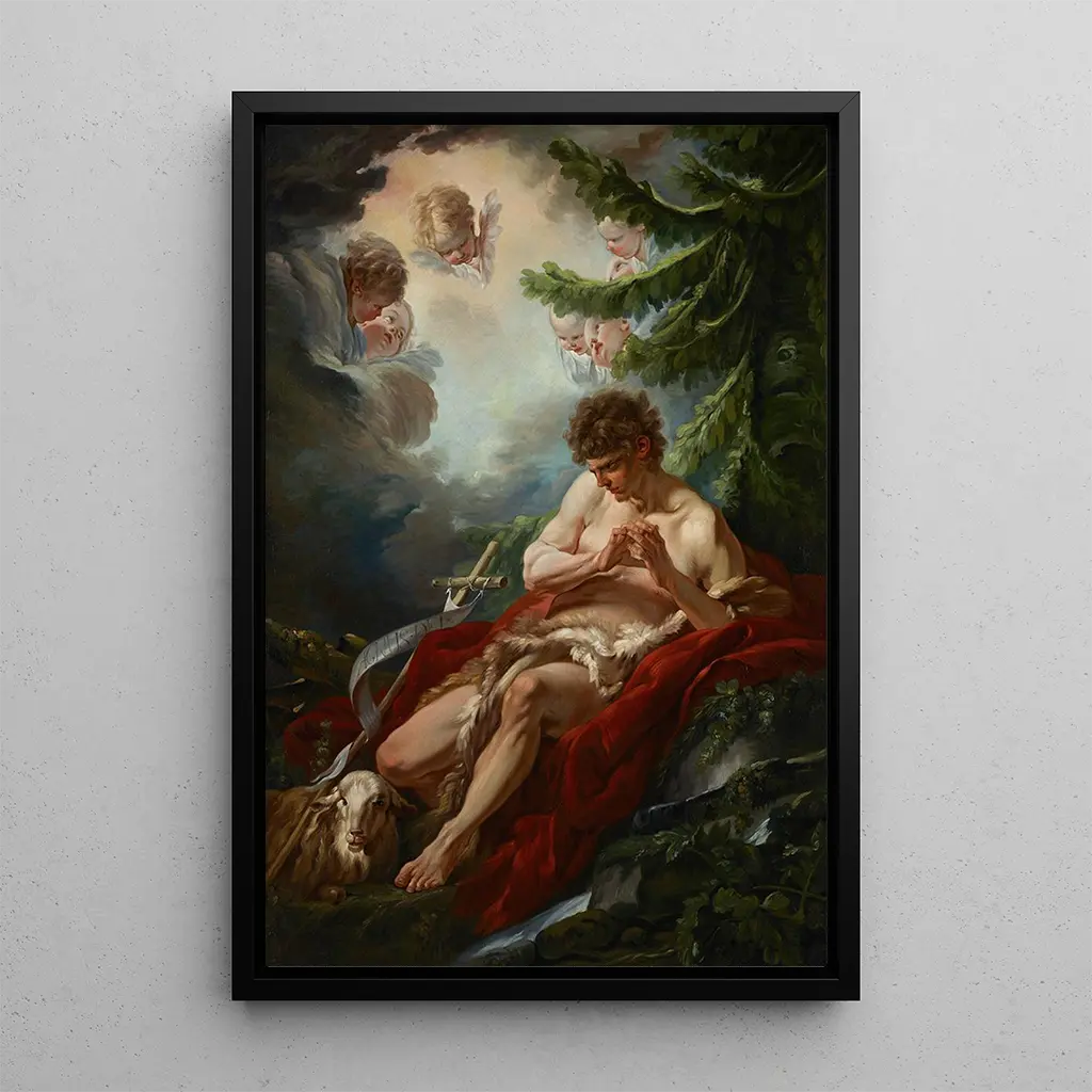 Saint Jean-Baptiste : une représentation spirituelle et captivante Dans "Saint Jean-Baptiste", François Boucher offre une vision à la fois spirituelle et sensuelle du célèbre prophète. La lumière douce qui éclaire le visage du saint crée une atmosphère de sérénité, tandis que les couleurs chaudes et terreuses ajoutent une dimension humaine à cette figure biblique. La composition met en avant le corps athlétique de Jean-Baptiste, drapé avec soin, qui attire le regard tout en évoquant une profonde spiritualité. La délicatesse des détails, des cheveux aux textures des vêtements, témoigne de l'habileté de Boucher à capturer l'essence de ses sujets. François Boucher : un pilier du rococo et de la peinture française François Boucher, né en 1703, est un artiste majeur du XVIIIe siècle, reconnu pour son style rococo flamboyant. Élevé dans un milieu artistique, il s'inspire des grands maîtres italiens et développe un langage visuel unique, alliant sensualité et élégance. Boucher est également célèbre pour ses portraits et ses scènes mythologiques, mais sa représentation de figures religieuses, comme Saint Jean-Baptiste, montre sa capacité à allier spiritualité et esthétique. En tant que peintre de la cour de Louis XV, il a su marquer son époque et influencer de nombreux artistes. Une acquisition décorative aux multiples atouts La reproduction de "Saint Jean-Baptiste" est un choix parfait pour ceux qui souhaitent ajouter une touche d'élégance à leur intérieur. Que ce soit dans un salon, une chambre ou un bureau, ce tableau apporte une atmosphère apaisante et inspirante. Sa qualité de reproduction assure une fidélité remarquable aux détails et aux couleurs de l'œuvre originale, permettant ainsi de profiter de son attrait esthétique au quotidien. En intégrant cette toile dans votre décoration, vous créez un espace qui invite à la réflexion et à la contemplation, tout en célébrant l'art classique.