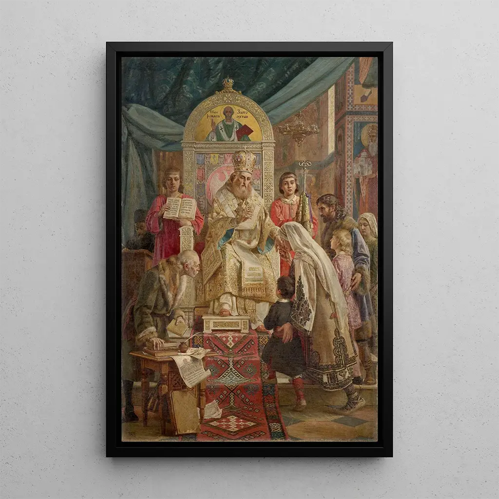 Saint Sava bénit Srpad : a symbol of faith and tradition "Saint Sava bénit Srpad" is an art print that embodies Serbian spirituality and culture. In this painting, Uro Predi depicts the saint in the act of blessing, raising his hand to bless the community. The rich colors and meticulous details of the robe and surrounding elements create a solemn and respectful atmosphere. The soft light illuminating Saint Sava's face emphasizes his authority and benevolence. This art print is not only a tribute to a historical figure but also an invitation to reflect on the values of faith and tradition that unite peoples. Uro Predi : an artist committed to representing cultural identity Uro Predi, recognized for his contributions to Serbian art, has captured the essence of his heritage through his works. His style, which combines realism and symbolic elements, reflects his dedication to the culture and spirituality of his country. Trained in traditional art schools, Predi was influenced by European artistic movements while remaining true to his roots. His works, such as "Saint Sava bénit Srpad," demonstrate his desire to preserve and transmit Serbian cultural identity through art. A decorative art print with multiple virtues The reproduction of "Saint Sava bénit Srpad" is an ideal choice for those wishing to add a spiritual dimension to their interior decoration. Whether in a living room, office, or prayer room, this canvas brings an atmosphere of serenity and reflection. Its printing quality guarantees fidelity to details and colors, allowing you to feel the full power of the original artwork. By choosing this art print, you give your space a touch of culture and spirituality, while celebrating Uro Predi's artistic heritage.