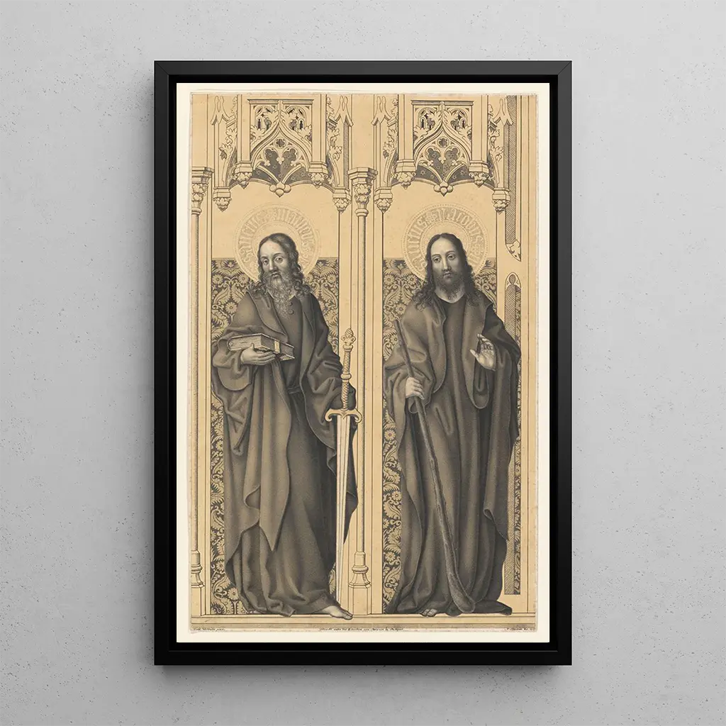 La reproduction de Saints Matthieu et Jacques nous transporte dans un monde où la spiritualité et l'art se rejoignent de manière saisissante. Les saints, représentés avec une intensité émotionnelle, sont entourés d'une lumière douce qui met en valeur les expressions de leur dévotion. Strixner utilise une palette de couleurs chaudes et riches, créant une atmosphère à la fois sereine et puissante. Les détails minutieux des drapés et des attributs des saints ajoutent une dimension tactile à cette œuvre, invitant le spectateur à s'immerger dans leur récit sacré.