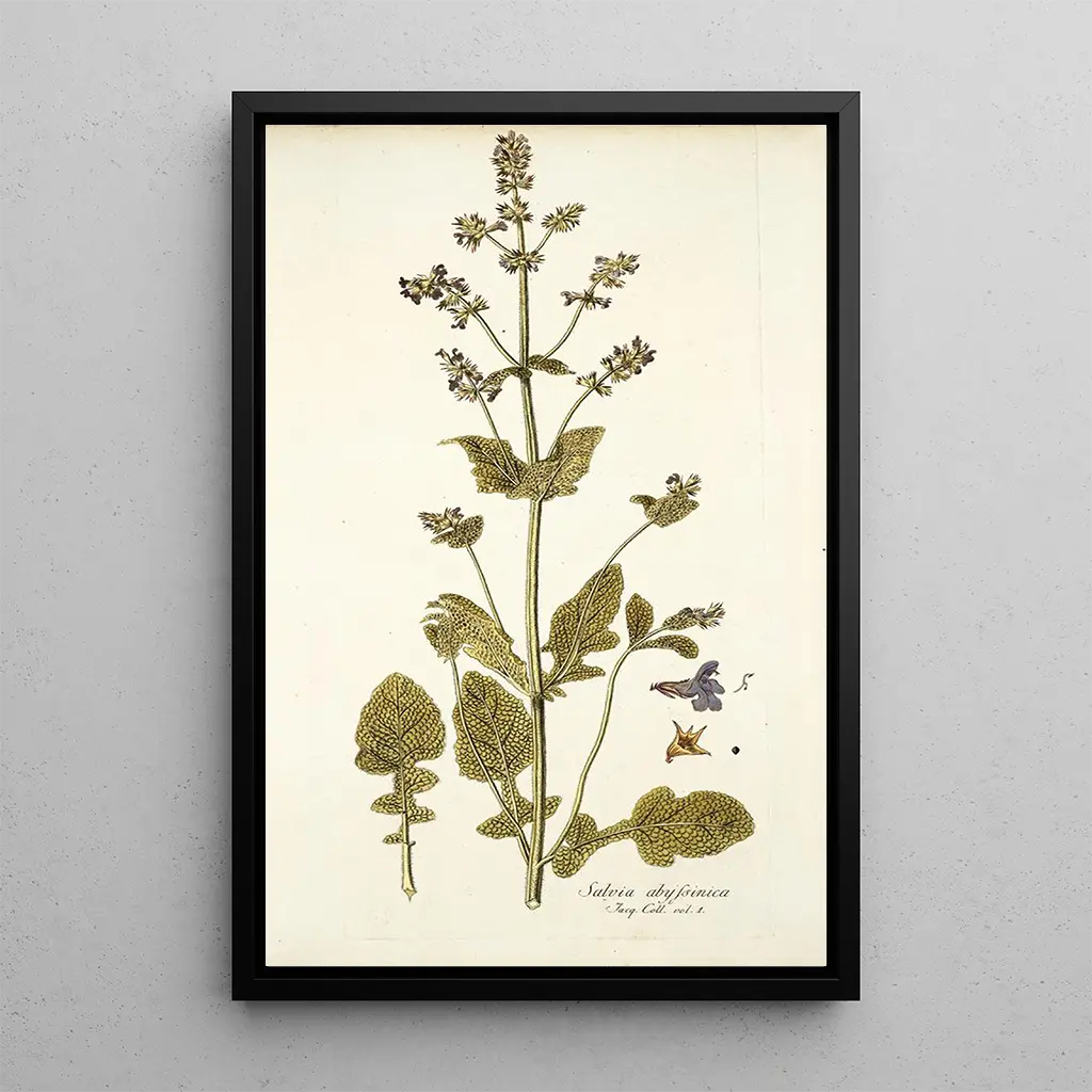 The art print of Salvia abyssinica, a work by Nikolaus Joseph Freiherr von Jacquin, immerses us in a universe where nature reveals itself with delicacy. The shades of green and purple blend harmoniously, creating a calming and contemplative atmosphere. The watercolor technique, executed with mastery, captures the lightness of the leaves and the depth of the flowers. Every detail is meticulously rendered, inviting the viewer to approach and appreciate the finesse of this plant. This painting, a true homage to biodiversity, evokes a sense of serenity and connection with the natural world.
