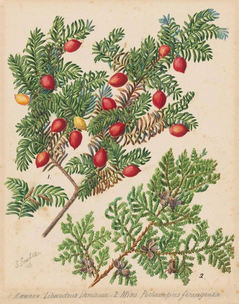 The artwork 'Miro Kawaka' by Sarah Featon highlights a majestic tree, a symbol of New Zealand's flora. Featon, renowned for her ability to capture the beauty of nature, depicts here the Miro, a tree that, beyond its ecological importance, plays a central role in Māori culture. Its representation is not only a tribute to the splendor of nature but also an exploration of the relationships between species and their environment. Featon's work, with its attention to detail and color, invites a deep contemplation of plant life. In a modern interior, this art print can enrich the space with its serene presence and cultural history. Discover the art print of this fascinating piece on Artem Legrand.