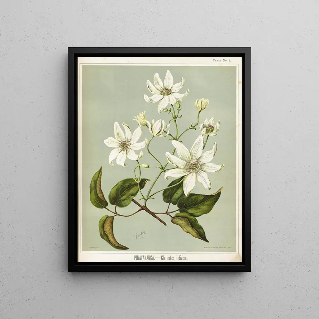In 'Puawananga Clematis indivisa', Sarah Featon highlights a climbing plant typical of New Zealand, known for its delicate flowers and vigorous growth. Through this artwork, Featon demonstrates her skill in capturing natural beauty while respecting botanical accuracy. The illustration, with its soft colors and refined details, evokes an atmosphere of serenity and connection with nature. This plant is not only appreciated for its aesthetic but also plays a role in local ecosystems. In a contemporary setting, this piece can enrich a space with its elegant and soothing presence. The art print of this work is available to discover on Artem Legrand.