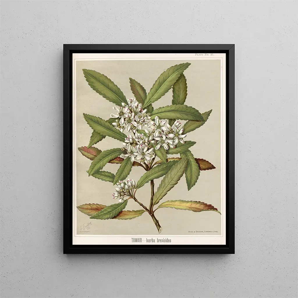 The artwork 'Tawari Ixerba brexioides' by Sarah Featon highlights a New Zealand tree, renowned for its beauty and rarity. Featon, as a botanical artist, manages to capture the majesty of this tree with particular attention to detail and aesthetics. This illustration, which combines scientific precision with artistic sensitivity, evokes the links between nature and art, while celebrating the richness of local flora. In a modern interior, this art print can bring a touch of serenity and connection with the natural environment. The art print of this work is available to discover on Artem Legrand.