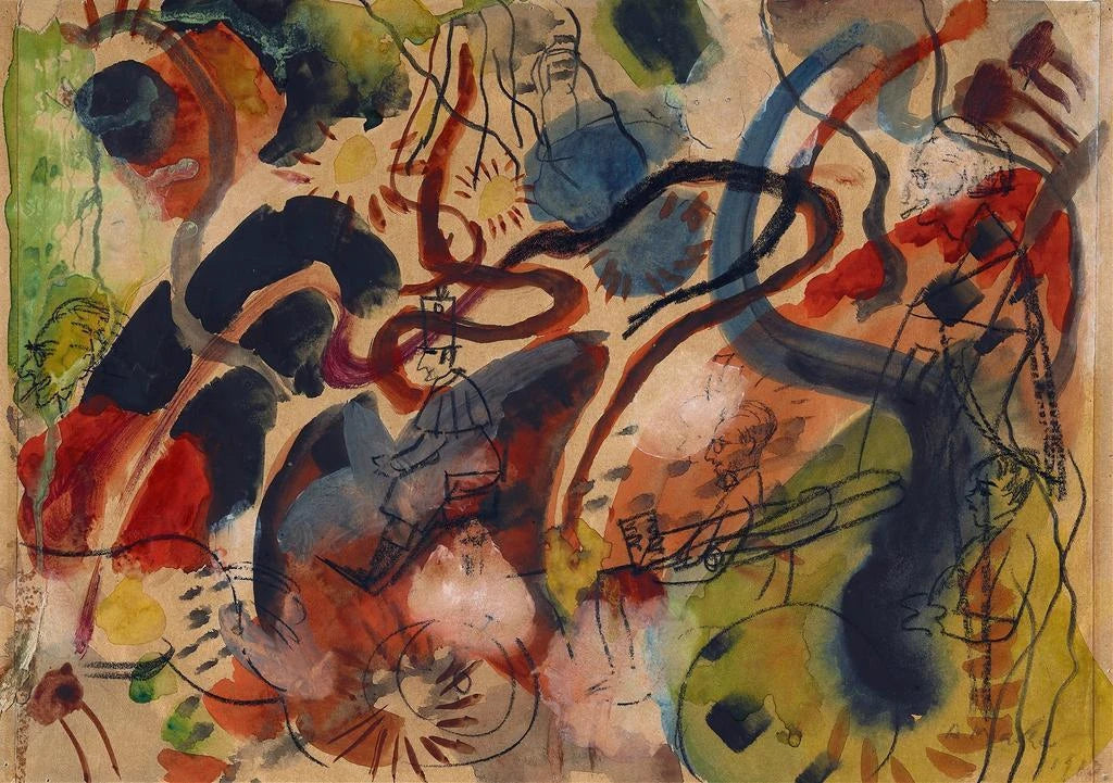 "Satirical figure on the Blue Rider" is a work that challenges with its boldness and humor. Macke, with vivid colors and stylized shapes, creates a scene where social satire blends with a modern aesthetic. The characters, with exaggerated features, seem to dance in a world where conventions are questioned. The watercolor technique, light and translucent, enhances the sense of dynamism and movement, making this art print both captivating and provocative.