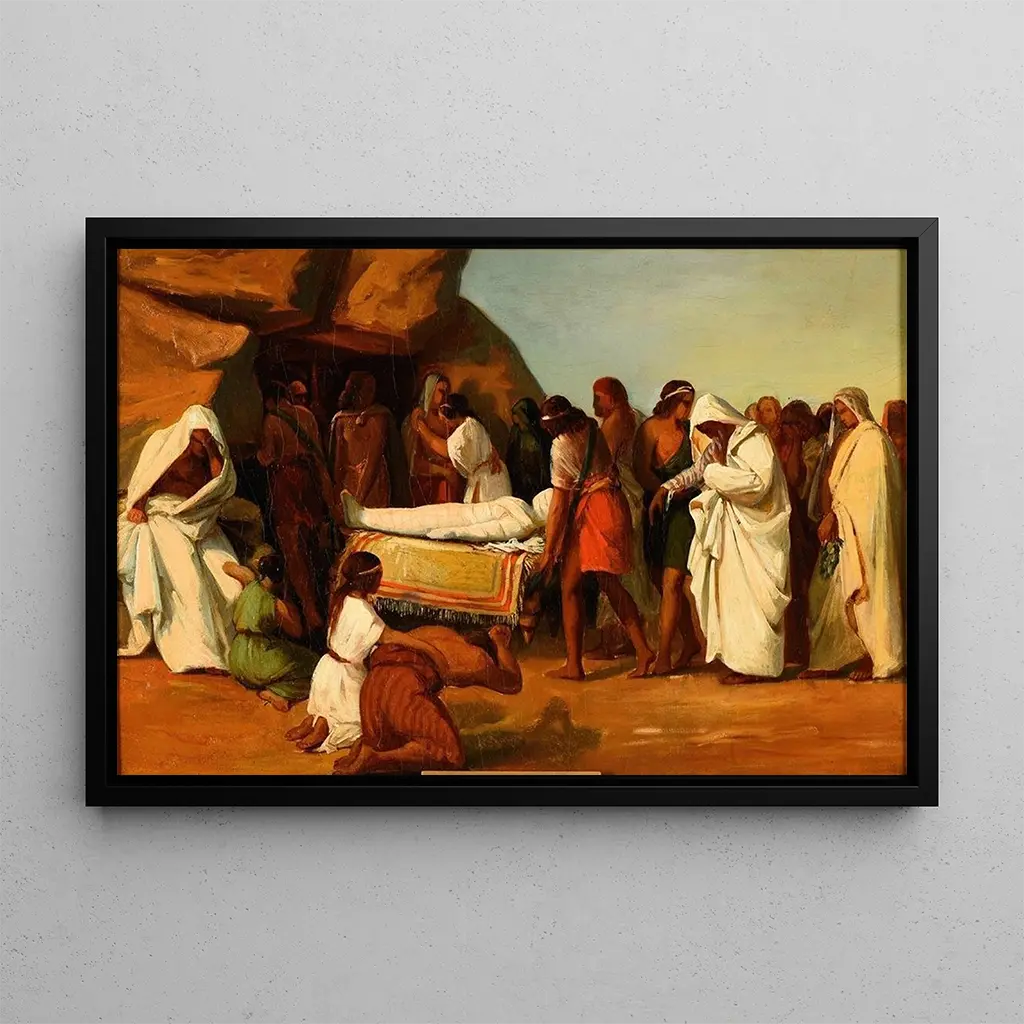 "Scene of a funeral" by Dominique Louis Papety is a poignant artwork that captures the solemn moment of passage. The composition is carefully orchestrated, where each character, dressed in black, expresses a deep emotion through gestures and meaningful gazes. Dark colors dominate, creating an atmosphere of reflection, while touches of light highlight faces filled with sadness. Papety's technique, blending realism and romanticism, brings this scene to life, inviting the viewer to reflect on the fragility of life and the importance of mourning rituals.
