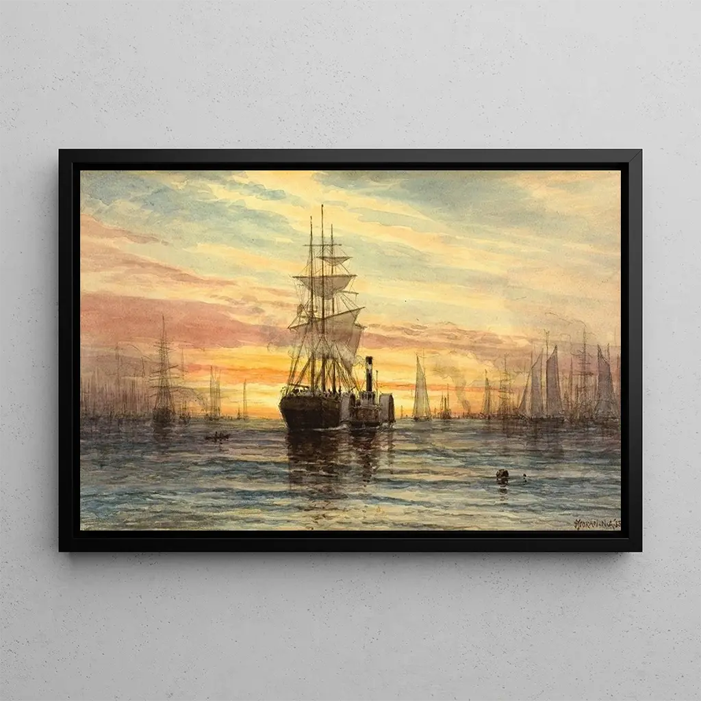 The art print Scene at the port by Thomas Moran immerses us in a lively and dynamic atmosphere, where shades of blue and green blend harmoniously to evoke the sea and sky. The white sails of the boats stand out against the colorful background, creating a striking contrast that captures the eye. Moran, a master of light, plays with reflections on the water, making the scene almost alive. Every detail, from the waves to the silhouettes of sailors, is carefully rendered, inviting the viewer to feel the movement and energy of this bustling port.
