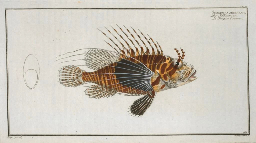 Scorpaena antennata: a masterpiece of marine life The art print of Scorpaena antennata reveals the majesty of scorpionfish, these fascinating creatures of coral reefs. This painting, with its vibrant colors and meticulous details, captures the very essence of underwater life. The warm hues of the animal contrast with the cooler shades of its environment, creating a captivating visual dynamic. The artist's technique highlights not only the beauty of the species but also the complexity of its habitat, inviting the viewer to dive into this rich and colorful ecosystem. Marcus Elieser Bloch: a master of artistic ichthyology Marcus Elieser Bloch, naturalist and artist of the 18th century, is renowned for his in-depth studies of fish. His work is the result of a time when scientific exploration and art intertwined to document biodiversity. Bloch traveled across Europe and beyond, drawing inspiration from maritime discoveries to enrich his representations. His meticulous approach not only helped better understand marine species but also set a standard for scientific illustration, combining precision and aesthetics. A decorative acquisition with multiple advantages The art print of Scorpaena antennata makes a remarkable decorative addition to any space. Whether in an office, living room, or bedroom, this painting adds a touch of exoticism and elegance. Its reproduction quality ensures fidelity to the original details, while offering a visual appeal that is sure to arouse interest. By choosing this canvas, you incorporate a piece of marine beauty into your decor, creating a calming and inspiring environment.