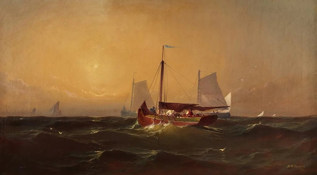 The art print of the canvas Scene of the sea with boats by Franklin D Briscoe evokes a peaceful atmosphere where the horizon blends with the reflections of the waves. The shades of blue and green harmonize beautifully, creating a sense of depth and serenity. The white sails of the boats, delicately painted, appear to float lightly, while the sky, dotted with clouds, adds a dramatic dimension to this maritime scene. Briscoe's impressionist technique, characterized by fluid brushstrokes, invites the viewer to immerse themselves in this idyllic vision of the sea.