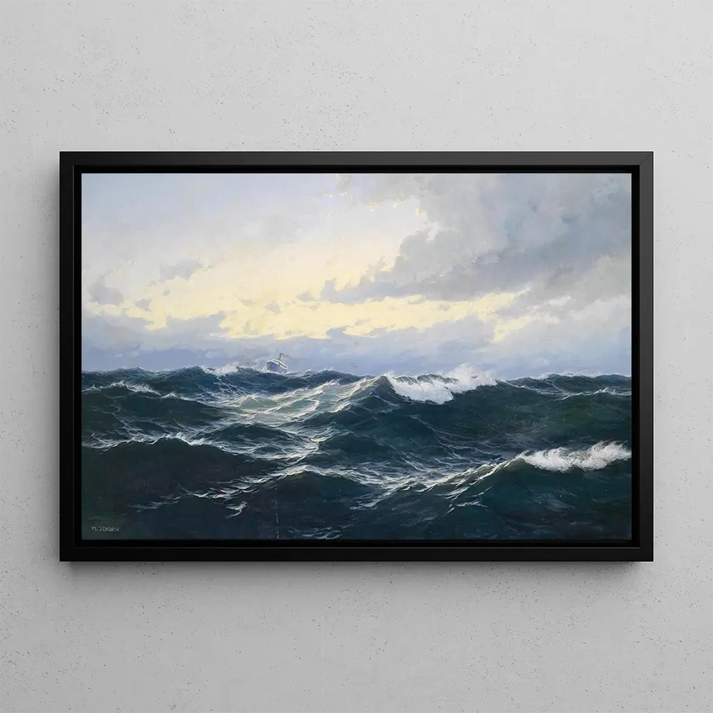 In this captivating artwork, the art print "Seascape with Steamship" by Max Jensen transports us to the water's edge, where steam gently rises, creating an atmosphere of tranquility. The shades of blue and green blend harmoniously, evoking the depth of the oceans and the lightness of the skies. Jensen's technique, both impressionist and realistic, allows you to feel the movement of the waves and the softness of the breeze. Each brushstroke seems to tell a story, inviting the viewer to immerse themselves in this soothing seascape.