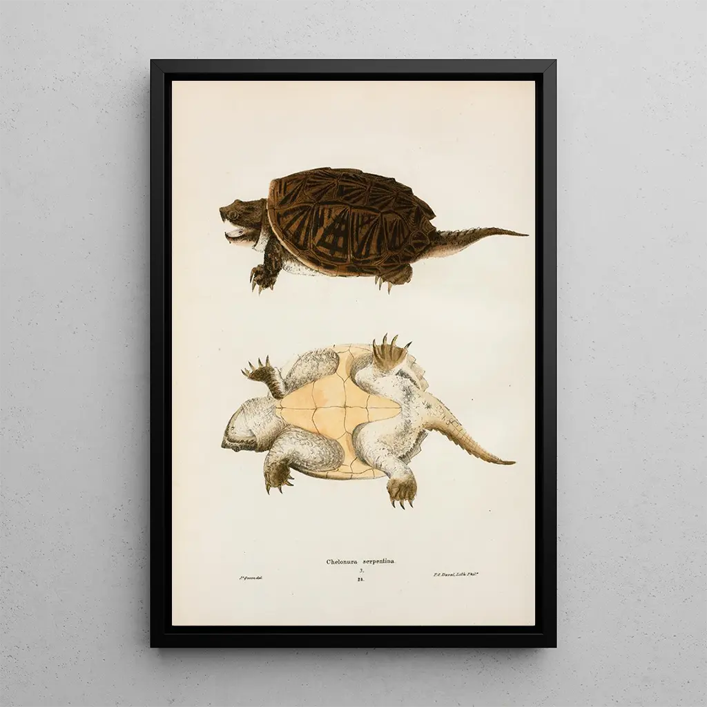 Tortue serpentine : an homage to reptilian beauty The art print of the Tortue serpentine reveals a captivating aquatic creature. With its elongated neck and delicate patterns, this turtle embodies the elegance of aquatic species. The shades of green and brown on its shell, combined with the smooth texture of its skin, create a visually striking harmony. The artist skillfully played with light to highlight the details of this turtle, making the work almost lifelike. The atmosphere emanating from this canvas invites contemplation and wonder, recalling the richness and diversity of the natural world. John Edwards Holbrook: a master of naturalist illustration John Edwards Holbrook, a 19th-century naturalist and artist, left his mark with precise and poetic illustrations. Specializing in reptiles and amphibians, he contributed to the scientific knowledge of these species through his works. Holbrook was influenced by the explorations and discoveries of his time, which enriched his work with a scientific dimension. His illustrations, both artistic and informative, helped raise public awareness of the beauty and fragility of wildlife. His legacy endures, making him an emblematic figure of zoological illustration. A decorative acquisition with multiple assets The art print of the Tortue serpentine is a wise decorative choice to enhance your interior, whether in a living room, office, or bedroom. Its unique design and soothing colors bring a touch of nature and serenity to your space. The quality of the print ensures remarkable fidelity to the details of the original work, guaranteeing lasting aesthetic appeal. By integrating this canvas into your decor, you create an inspiring atmosphere where art and nature meet, enriching your living environment.