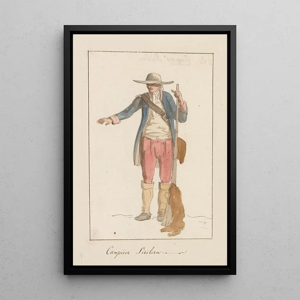 The art print "Man from Sicily in traditional costume" by Abraham Louis Rodolphe Ducros is a striking depiction of a man dressed in his traditional attire. The vivid colors and meticulous details of the outfit evoke the richness of Sicilian culture. The light plays on the fabrics, creating a warm and welcoming atmosphere. The subject's gaze, both proud and contemplative, invites the viewer to delve into the history and traditions of this Mediterranean region. This art print, through its realism and expressiveness, transports us to a frozen moment where local identity is highlighted with brilliance.