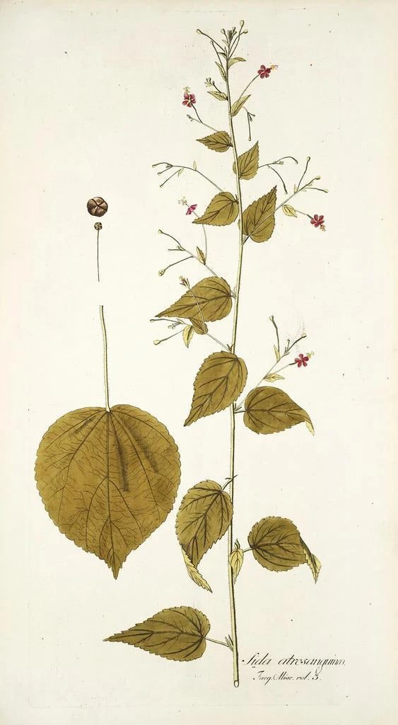 The art print of Sida atrosanguinea immerses us in a fascinating botanical universe, where vibrant shades of red and green intertwine with delicacy. This piece, created with meticulous precision, highlights the details of the leaves and flowers, capturing the very essence of the plant. The watercolor technique used by the artist lends a lightness to the overall composition, creating an atmosphere that is both serene and lively. Each brushstroke seems to tell a story, inviting the viewer to explore the beauty of nature through an artistic lens.