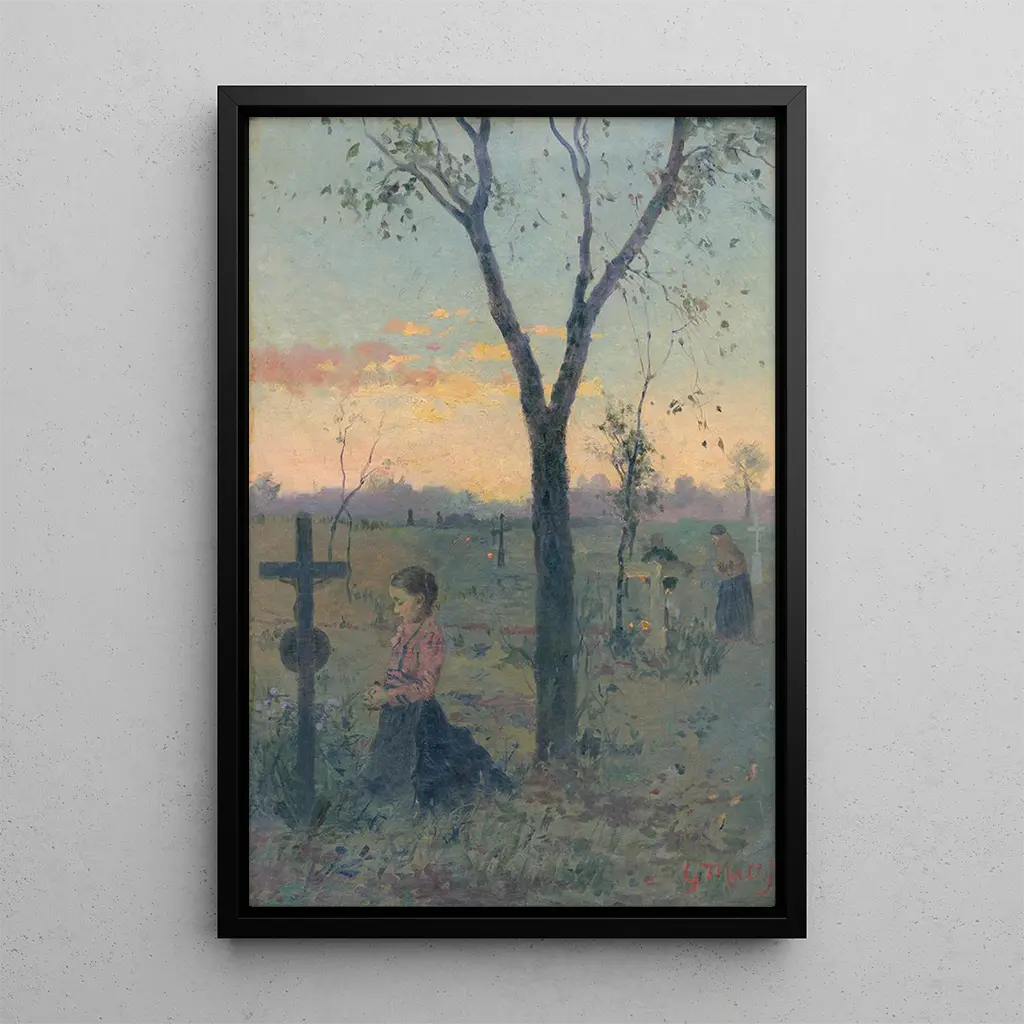 The art print of "Silent prayer on a tomb" evokes an atmosphere filled with serenity and sadness. The dark colors and delicate shades blend to create a canvas that invites reflection. The artist's technique, which plays with shadows and light, enhances the emotion conveyed by this piece. Every brushstroke seems to tell a story, that of a silent tribute, of preserved memory. This work, both simple and profound, transports us to a universe where time appears to stand still, encouraging us to contemplate the beauty of the ephemeral.