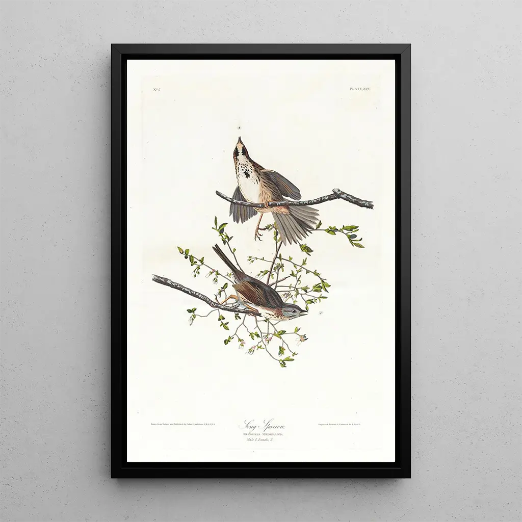 Le tableau "Bruant chanteur" de John James Audubon est une représentation saisissante de cet oiseau mélodieux, capturant l'instant où il se prépare à chanter. Avec des couleurs chaudes et des détails minutieux, cette œuvre évoque la joie et la vitalité de la nature. Les nuances de brun et de jaune se mêlent avec élégance, tandis que le fond délicat met en valeur la beauté de l'oiseau. Audubon, en véritable maître de l'observation, réussit à transmettre l'énergie et l'essence de cet oiseau, invitant le spectateur à se plonger dans un monde où la musique de la nature résonne.