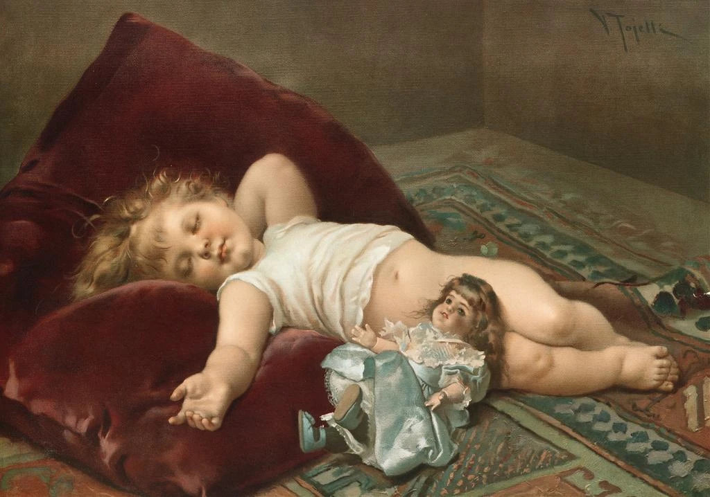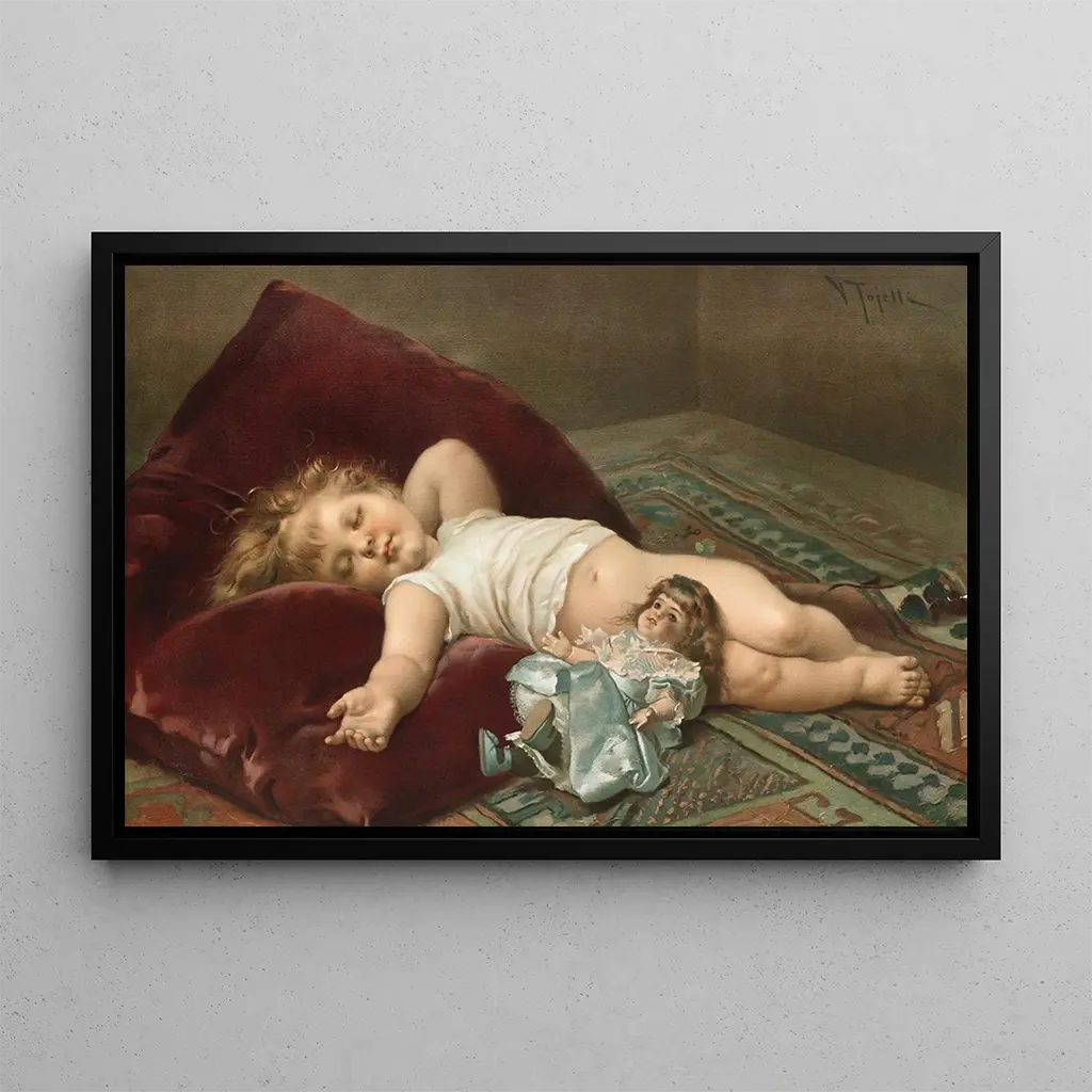 Baby Sleeping: a tenderness suspended in time. The art print of "Baby Sleeping" by Virgilio Tojetti captures a moment of pure sweetness and innocence. The pastel color palette, with shades of pink and blue, evokes a peaceful and comforting atmosphere. Tojetti's technique, which blends realism and sensitivity, allows you to feel the serenity of this little sleeping being. Every detail, from the gentle movement of the sheets to the delicate expressions on the face, creates a strong emotional connection with the viewer. This piece is an ode to the beauty of childhood, inviting contemplation and tenderness. Virgilio Tojetti: a master of genre painting. Virgilio Tojetti, an Italian painter of the 19th century, is known for his genre scenes and portraits imbued with realism. Influenced by Romanticism, he captured intimate and moving moments of everyday life. Tojetti often depicted children, highlighting their innocence and natural beauty. His career, although less well-known than that of some contemporaries, has left a lasting mark in the art world. "Baby Sleeping" is a perfect example of his talent, illustrating his ability to seize fleeting moments with great emotional depth. A decorative acquisition with multiple assets. This art print of "Baby Sleeping" is a perfect choice to add a touch of softness to your interior decor. Whether in a child's bedroom, a living room, or an office, it creates a warm and soothing ambiance. The quality of the print ensures remarkable fidelity to the original work, while offering undeniable visual appeal. By integrating this canvas into your space, you add a piece that evokes tenderness and serenity, while enriching your environment with a unique artistic touch. It is a work that will appeal to both young and old, while beautifying your interior.