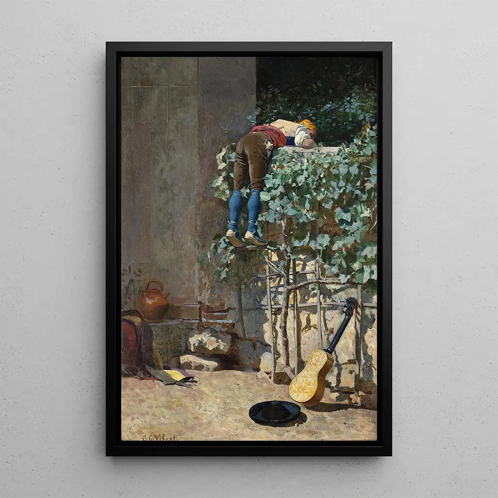 A quick glance: a charming scene of everyday life In "A Quick Glance," Jehan Georges Vibert captures a delicate moment where a young woman, dressed in an elegant dress, exchanges a knowing look. The composition is rich in detail, with warm colors and play of light creating an intimate atmosphere. Vibert's technique, blending realism and impressionist touches, brings this scene to life, making the emotion it conveys almost tangible. The textures of the fabrics and the reflections in the surrounding objects testify to an exceptional craftsmanship, inviting the viewer to immerse themselves in this suspended moment. Jehan Georges Vibert: a master of the genre Jehan Georges Vibert, active at the end of the 19th century, is renowned for his genre scenes that evoke everyday life with a touch of poetry. Influenced by the great masters of French painting, he develops a style that combines finesse and sensitivity. His career is marked by a constant search for beauty in details, allowing him to stand out in a rapidly changing artistic context. Vibert's works, often imbued with a certain nostalgia, reflect an era when art aimed to capture moments of life with great delicacy. A decorative acquisition with multiple assets The art print of "A Quick Glance" is an ideal choice to enhance your interior, whether in a living room, office, or bedroom. Its print quality and fidelity to the original artwork guarantee undeniable aesthetic appeal. This painting, with its warm ambiance and timeless charm, will delight your guests and add a touch of elegance to your decor. By choosing this canvas, you opt for a piece that not only beautifies your space but also tells a story, that of a frozen moment in time.