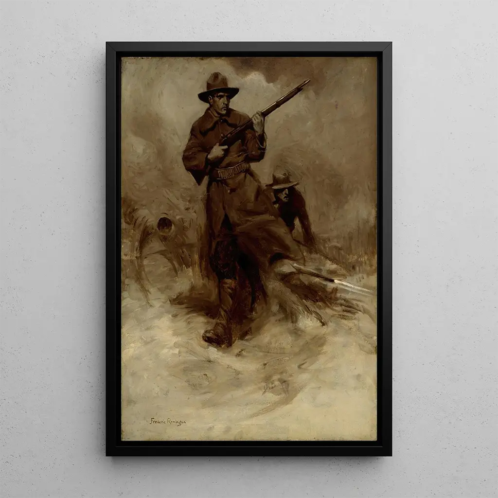 The art print of Soldiers of the Spanish-American War in Action depicts a dynamic and emotionally charged scene, where soldiers fight bravely. The dark colors and striking contrasts emphasize the tension of the moment, while the details of the uniforms and the expressions of the characters add dramatic depth to the work. The painting technique used by Gilbert Gaul, with its energetic brushstrokes, conveys a sense of movement and urgency, immersing the viewer in the heart of military action.
