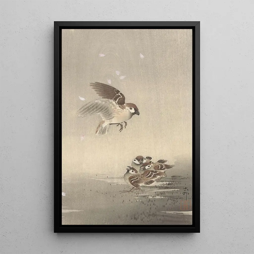 In this art print of the painting "Little sparrow with chick," Ohara Koson captures a delicate moment in nature. The soft colors and subtle shades of brown and beige evoke a peaceful atmosphere, while the Japanese woodblock print technique highlights the finesse of the details. The sparrow, depicted with great precision, seems to watch over its young, creating a touching scene that invites contemplation. The blurred background emphasizes the simplicity and elegance of this interaction between the mother and her chick, offering a soothing view of wildlife.