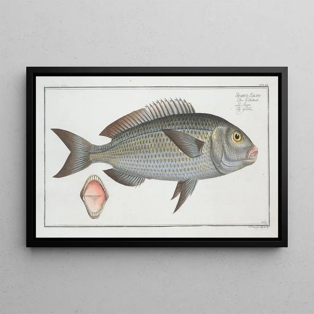 Sparus Salpa Le Goldlin : an ode to marine life The art print of "Sparus Salpa Le Goldlin" by Marcus Elieser Bloch is a true celebration of marine biodiversity. This naturalist painting, depicting the sparus salpa, highlights the beauty and delicacy of this fish with vibrant colors. The meticulous details of the representation, from the shimmering scales to the reflections of light on the water, showcase the artist's skill. Bloch, using engraving and painting techniques, manages to capture the very essence of aquatic life, inviting the viewer to dive into a fascinating and mysterious underwater universe. Marcus Elieser Bloch : pioneer of artistic ichthyology Marcus Elieser Bloch, a German naturalist and artist of the 18th century, is often regarded as one of the pioneers of ichthyology, the study of fish. His passion for nature led him to create works that combine science and art, such as the art print of "Sparus Salpa Le Goldlin." Bloch traveled across Europe and beyond to study and depict various fish species, thus contributing to the scientific knowledge of his time. His meticulous approach and attention to detail make his works essential references for marine biology and art enthusiasts. The significance of his work lies in his ability to blend aesthetics and knowledge. A decorative acquisition with multiple assets Choosing an art print of "Sparus Salpa Le Goldlin" for your interior is an excellent way to bring a touch of nature and elegance. Whether in an office, dining room, or bedroom, this canvas will captivate your guests' attention and enhance your decor. The quality of the reproduction guarantees fidelity to the colors and details of the original work, allowing you to fully enjoy its charm. With its aesthetic appeal and scientific story, this piece becomes a decorative element that stimulates curiosity and wonder, transforming your space into a true sanctuary of nature.