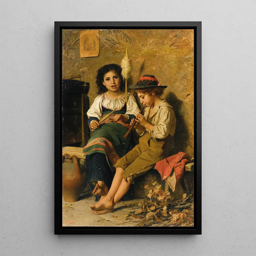 The art print of Fileuse and flute player, a work by Luigi Bechi, transports us to a moment of tenderness and complicity. The delicate composition features a focused spinner, while a musician plays the flute, creating a visual and auditory harmony. The pastel colors, soft and soothing, envelop the scene in an intimate atmosphere. Bechi's technique, blending realism and impressionist touches, brings this human interaction to life, where each character seems to tell a story through their gestures and expressions.