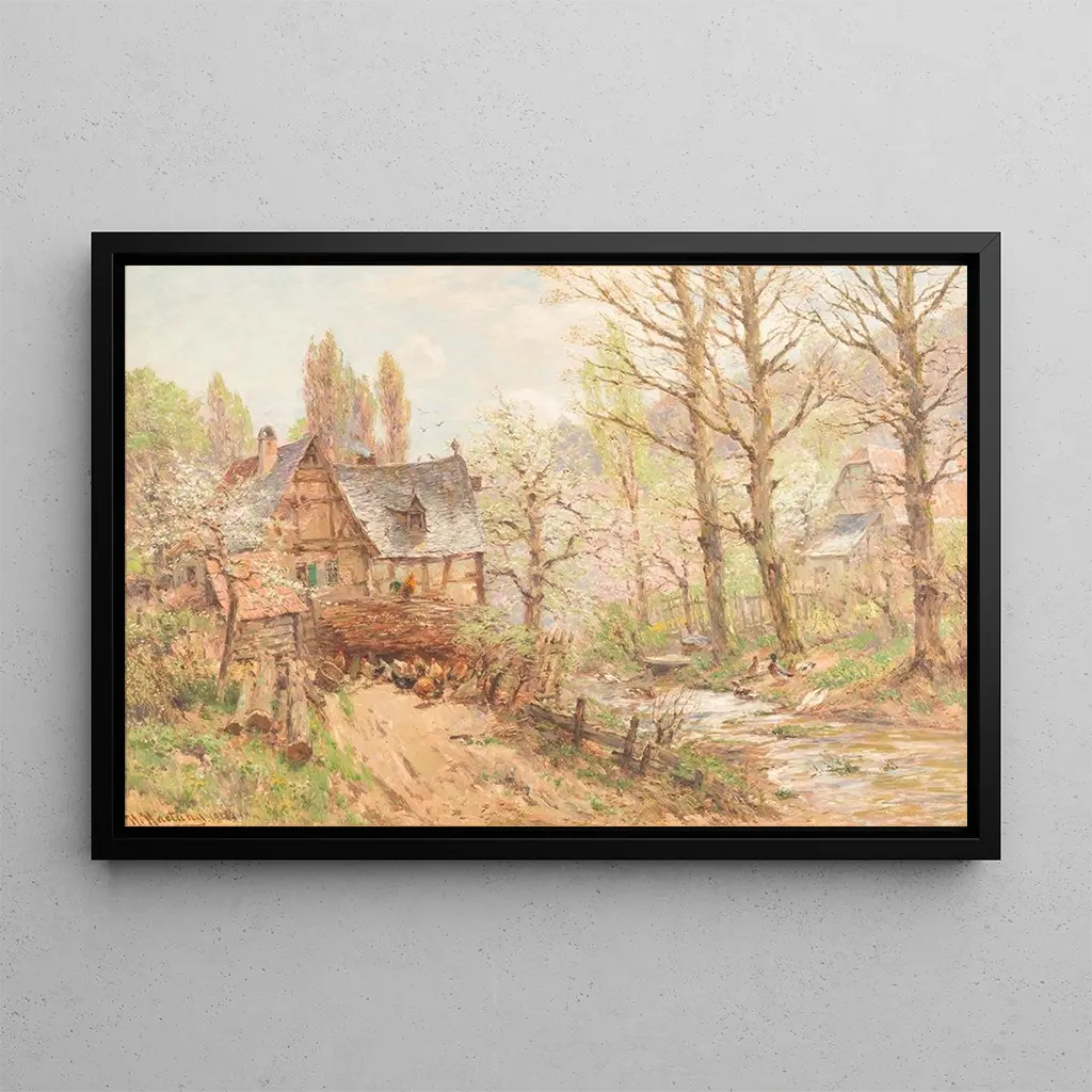 Heinrich Hartung, a German painter of the 20th century, is renowned for his ability to capture the beauty of rural landscapes. Influenced by the Impressionist movement, he developed a personal style that combines realism and poetry. Hartung dedicated his career to representing nature, seeking to immortalize the light and colors of the seasons. His work reflects an era when artists turned to nature for inspiration and comfort, in response to the upheavals of the modern world. "Farm in Spring" perfectly aligns with this approach, demonstrating his commitment to the beauty of the natural world.