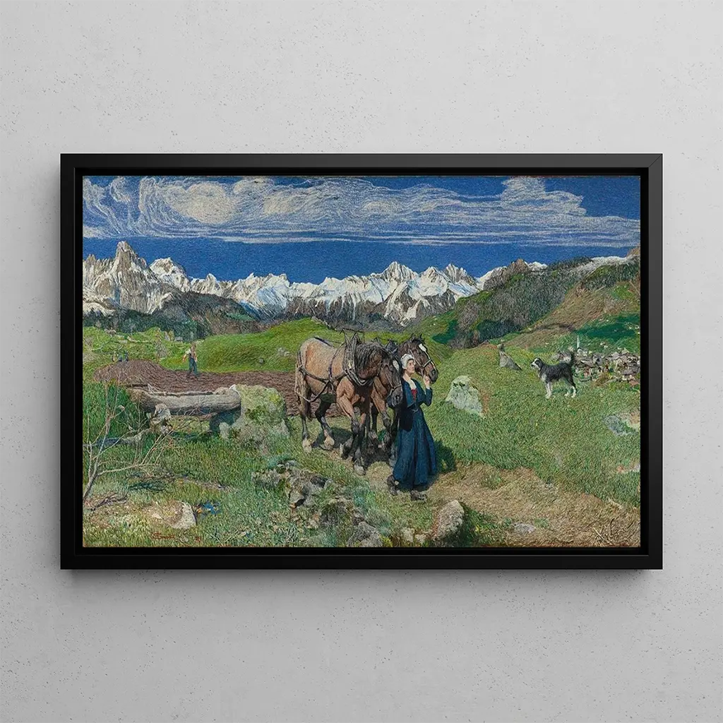 The art print of "Spring in the Alps" by Giovanni Segantini evokes an explosion of colors and light, capturing the very essence of spring renewal. The majestic mountains, bathed in sunlight, stand in the background, while alpine flora blooms in a festival of vibrant hues. Segantini, with his divisionist technique, uses juxtaposed strokes of color to create a unique luminosity, bringing this idyllic scene to life. The figures, in harmony with their environment, seem to celebrate the beauty of nature, inviting the viewer to feel the joy and vitality of this season.