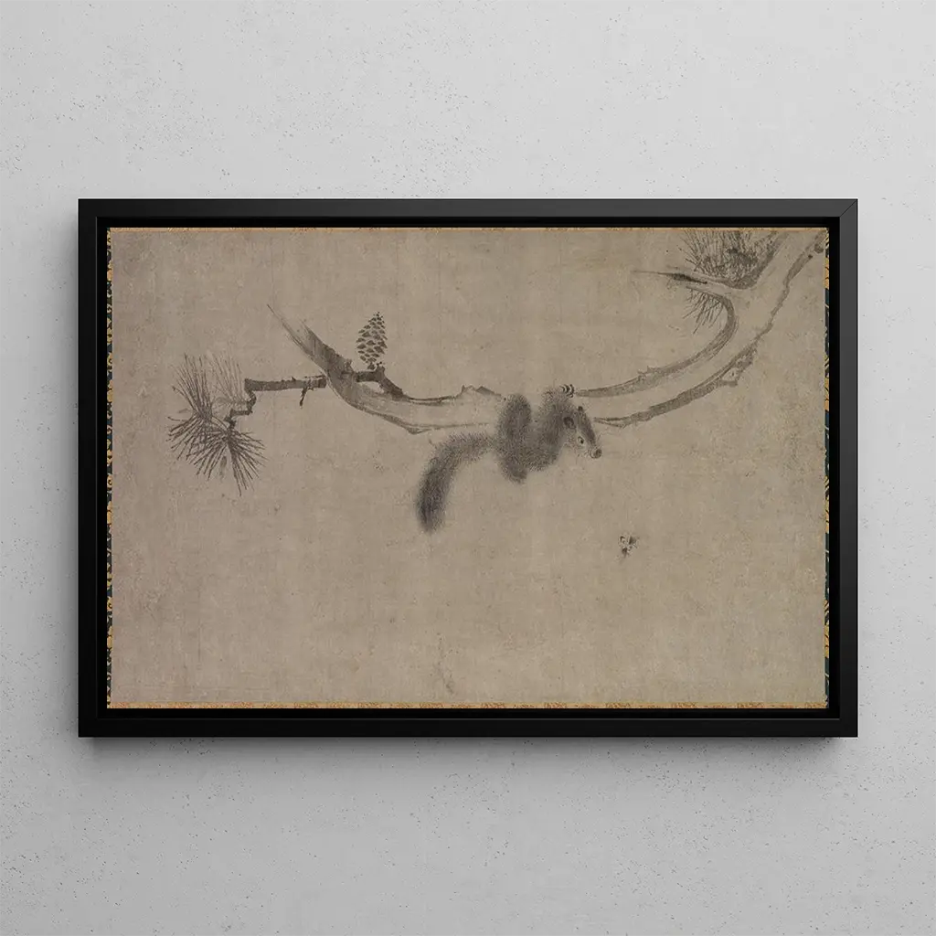 The art print of the Squirrel on a pine branch, by Song Tian, captures a fleeting moment of wildlife. The painting, rich in detail, features a brightly colored squirrel confidently perched on a branch adorned with majestic pines. The shades of green and brown, skillfully blended, create an atmosphere that is both lively and soothing. Song Tian's pictorial technique, which combines realism and sensitivity, allows you to feel the lightness and agility of the animal, while evoking the natural beauty of its habitat.