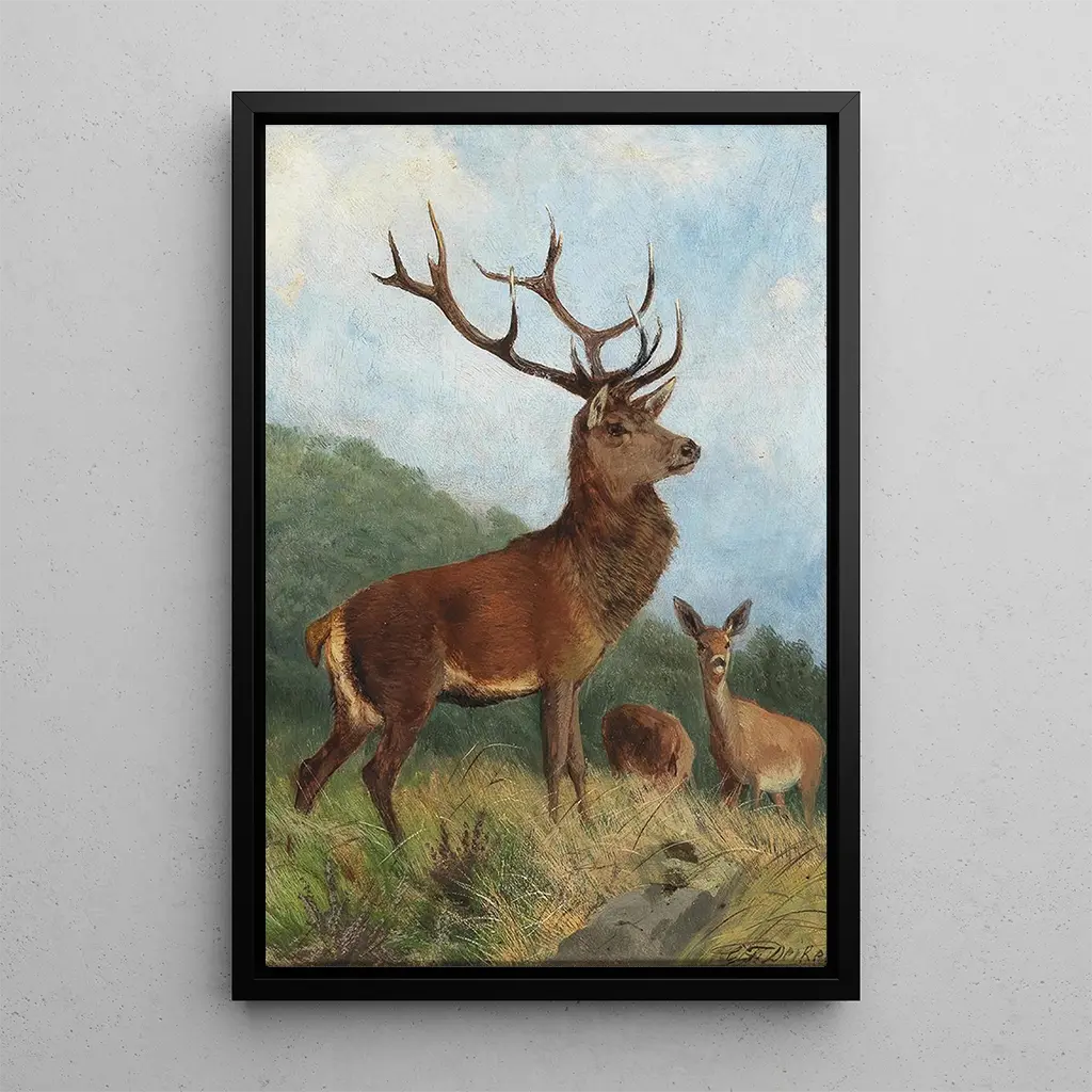 Cerf dominant : une majesté sauvage capturée Dans cette œuvre saisissante, "Cerf dominant", Carl Friedrich Deiker nous plonge au cœur d'une nature vibrante et sauvage. La composition met en avant un cerf majestueux, dont les bois imposants s'élèvent avec fierté, symbolisant la force et la noblesse de l'animal. Les couleurs terreuses, mêlées à des touches de vert, évoquent une forêt luxuriante, tandis que la lumière douce joue sur le pelage du cerf, créant une atmosphère à la fois sereine et puissante. La technique de Deiker, qui allie réalisme et sensibilité, nous invite à contempler la beauté brute de la faune. Carl Friedrich Deiker : un maître du réalisme animalier Carl Friedrich Deiker, actif au XIXe siècle, est reconnu pour ses représentations d'animaux dans leur habitat naturel. Influencé par le mouvement romantique, il a su capturer l'essence même de ses sujets avec une précision remarquable. Ses œuvres témoignent d'une profonde admiration pour la nature et ses créatures, reflétant une époque où l'art animalier prenait une place prépondérante dans le paysage artistique. Deiker, souvent en quête d'authenticité, a su immortaliser des moments fugaces de la vie sauvage, faisant de lui un artiste incontournable dans le domaine du réalisme animalier. Une acquisition décorative aux multiples atouts La reproduction du "Cerf dominant" est une pièce décorative qui saura enrichir n'importe quel intérieur, que ce soit dans un salon, un bureau ou une chambre. Sa qualité d'impression et sa fidélité aux détails de l'œuvre originale en font un choix idéal pour les amateurs d'art et de nature. Avec son attrait esthétique indéniable, ce tableau apporte une touche d'élégance et de sérénité à votre espace, tout en suscitant l'admiration de vos invités. Opter pour cette toile, c'est faire le choix d'une décoration qui allie beauté, histoire et respect de la nature.