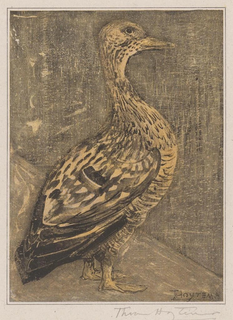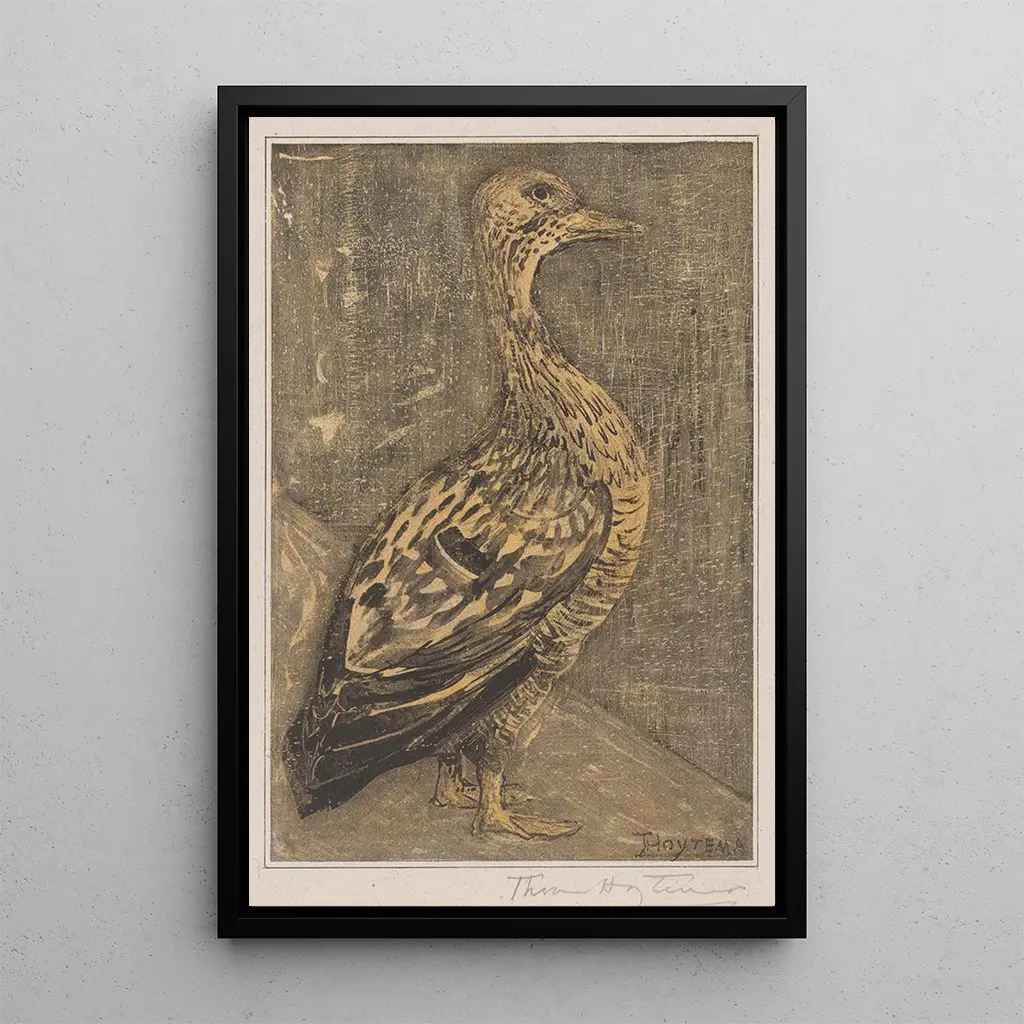 The art print "Canard debout" by Theo van Hoytema features a majestic duck, frozen in an elegant posture. The vibrant colors of the plumage, ranging from deep green to warm brown, are highlighted by a delicate natural background. The artist employs a painting technique that combines precision and fluidity, making the scene lively and dynamic. The duck's expression, both alert and serene, invites the viewer to appreciate the beauty of wildlife. This piece is a true celebration of nature, capturing a moment of animal life with remarkable sensitivity.