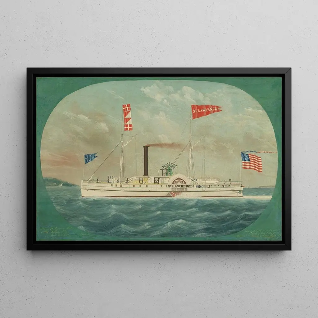 The canvas "Saint-Laurent Steamship" by James Bard captures the very essence of the Saint-Laurent River, with its turbulent waters and lush landscapes. The shades of blue and green intertwine, creating an atmosphere that is both dynamic and soothing. The oil on canvas technique allows Bard to play with light, bringing to life the steam rising from the steamship, a symbol of the industrial era. This art print invites a visual journey, where one can almost hear the sound of the waves and the whistle of the steamer, while admiring the natural beauty surrounding it.