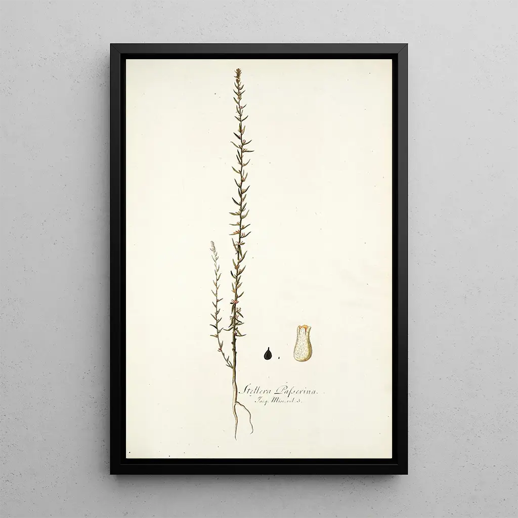 Stellera passerina: a delicate harmony of colors The art print of Stellera passerina, a work by Nikolaus Joseph Freiherr von Jacquin, immerses us in a world of natural beauty. This canvas, rich in detail, captures the very essence of the plant with remarkable precision. The pastel colors, ranging from soft pink to delicate green, create a soothing and contemplative atmosphere. The watercolor technique, used with finesse, highlights the subtle nuances of the petals and leaves, while adding depth to the overall composition. The piece invites careful observation, revealing the complexity and delicacy of nature. Nikolaus Joseph Freiherr von Jacquin: a pioneer of artistic botany Nikolaus Joseph Freiherr von Jacquin, an 18th-century botanist and artist, played a crucial role in the study of exotic plants. Trained in Vienna, he was influenced by the scientific discoveries of his time, notably during his travels in South America and the Caribbean. His works, such as this art print of Stellera passerina, testify to his commitment to combining science and art. Jacquin contributed to the classification of plants while immortalizing them on canvas, earning him an important place in the history of botanical art. His style, both rigorous and poetic, continues to inspire art and botany enthusiasts. A decorative acquisition with multiple assets The art print of Stellera passerina is a decorative piece that harmoniously fits into various spaces, whether a living room, an office, or a bedroom. Its soft and soothing palette brings a touch of freshness and serenity to your interior. The quality of the print guarantees fidelity to the colors and details of the original work, allowing you to enjoy its aesthetic appeal daily. By choosing this canvas, you opt for a refined decoration that evokes the beauty of nature while enriching your living environment.