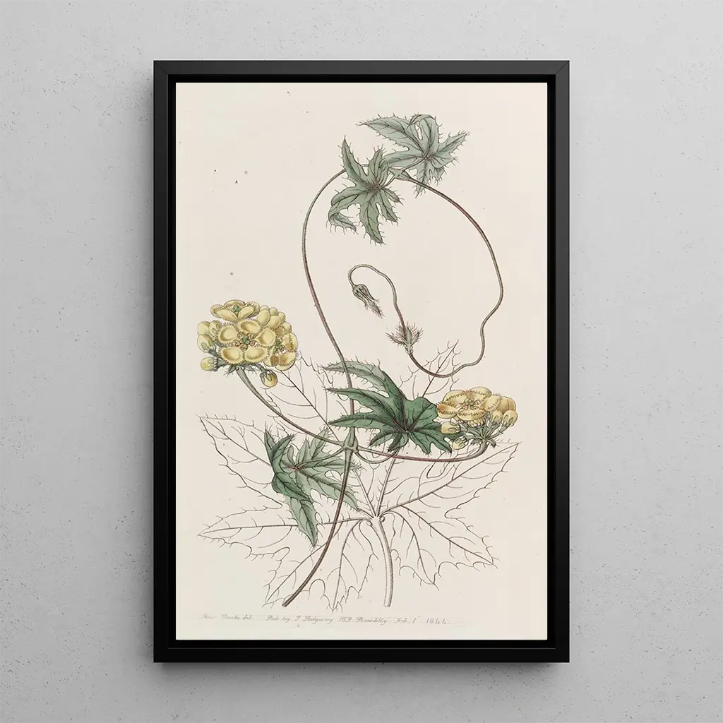 Stigmaphyllon with Jatropha leaves: a burst of life and color. The art print of the painting "Stigmaphyllon with Jatropha leaves" by Sydenham Edwards transports us into a vibrant universe where nature expresses itself with brilliance. The vivid shades of green and red blend harmoniously, creating a striking contrast that immediately catches the eye. Edwards, a master of watercolor, manages to capture the texture of the leaves and the delicacy of the flowers with remarkable precision. The work exudes a lively and dynamic atmosphere, celebrating the diversity and beauty of tropical plants. Sydenham Edwards: an artist dedicated to botanical science. Sydenham Edwards, a botanical illustrator from the early 19th century, made his mark with detailed and scientific works. His illustrations, including "Stigmaphyllon with Jatropha leaves," are the result of meticulous observation and a passion for botany. Influenced by scientific advances and botanical explorations, Edwards knew how to combine art and science, making his works not only aesthetic but also educational. His work contributed to a better understanding of exotic plants and enriched botanical knowledge of his time. A decorative acquisition with multiple assets. The art print of "Stigmaphyllon with Jatropha leaves" is an ideal decorative choice to bring a touch of nature into your interior. Whether in a living room, office, or bedroom, this canvas will appeal through its print quality and fidelity to the original colors. It invites contemplation and escape, while adding a note of freshness and vitality to your space. By choosing this piece, you opt for a decorative element that is both aesthetic and evocative of natural beauty.