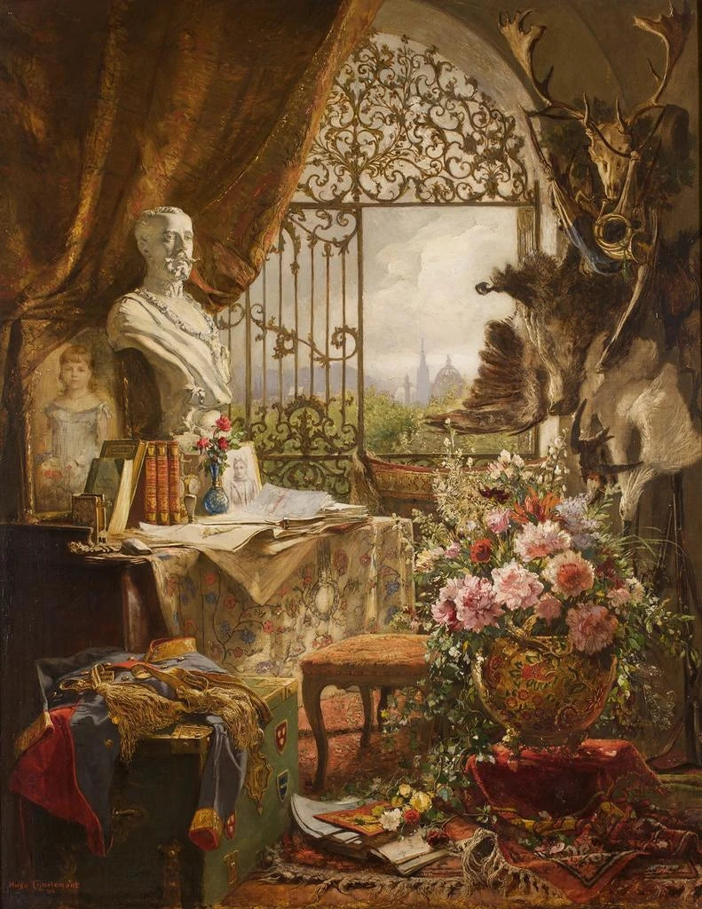 Still life with the heir prince Rodolphe's bust - Hugo Charlemont Source: Nature morte avec buste du prince héritier Rodolphe - Hugo Charlemont