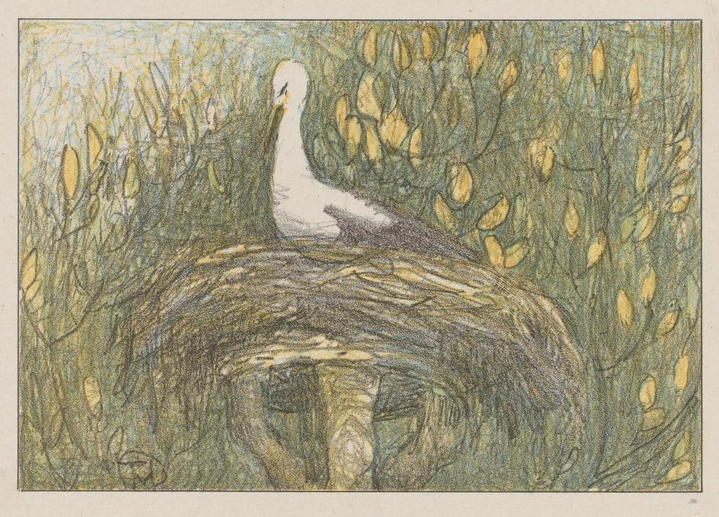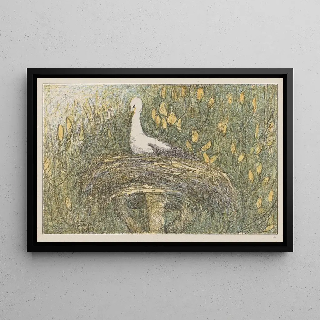 Theo van Hoytema, a Dutch painter from the early 20th century, is renowned for his unique approach to naturalism. Influenced by the artistic movements of his time, he captured the beauty of the natural world with rare sensitivity. His career, marked by travels across Europe, allowed him to explore various styles while remaining faithful to his love for nature. "Stork in the nest" is part of a period when art turned towards more introspective themes, reflecting a quest for connection with the environment. Hoytema thus left a lasting legacy, celebrating wildlife and flora through his works.