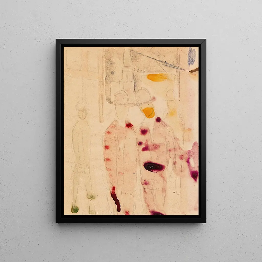 "Rue avec des gens petits" is an emblematic example of August Macke's unique style, characterized by his daring use of color and light. The characters, although depicted on a reduced scale, are imbued with palpable vitality, as if they were dancing in a silent ballet at the heart of the city. The vibrant shades of blue, yellow, and red intertwine harmoniously, creating an atmosphere that is both dynamic and soothing. The flowing lines and simplified forms reflect the influence of contemporary artistic movements, while revealing the artist's personal sensitivity. The art print invites the viewer to immerse themselves in a world where everyday life becomes poetic, where each figure tells a story in itself.