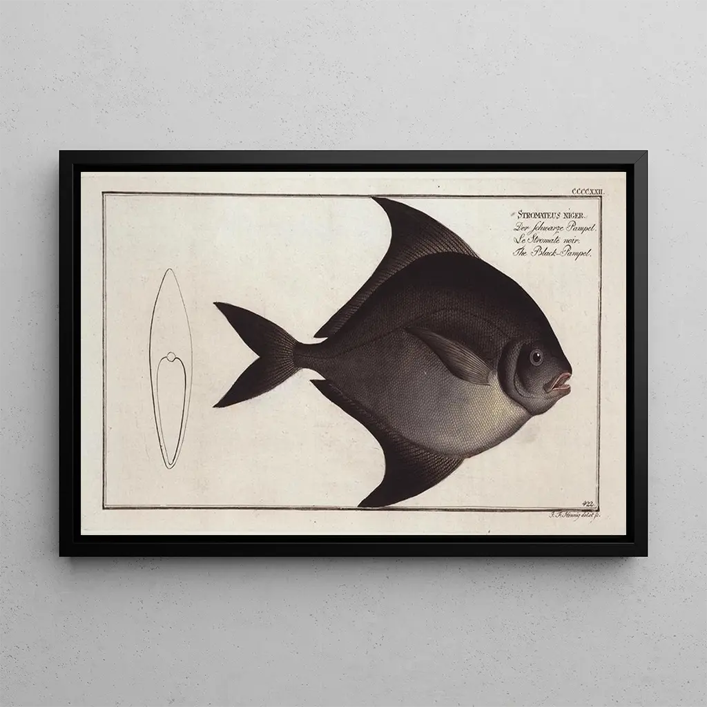 The art print of "Stromateus niger", commonly known as the Black Pampel, offers a striking glimpse into marine life. This print highlights shades of blue and green that evoke oceanic depths, while showcasing the fish with remarkable precision. Marcus Elieser Bloch's technique, which combines realism and meticulous detail, allows you to feel the fluidity of water and the lightness of the Black Pampel. This piece transports us to an underwater universe, revealing the beauty and diversity of aquatic fauna. Marcus Elieser Bloch: pioneer of artistic ichthyology Marcus Elieser Bloch, active in the 18th century, was a German artist and naturalist renowned for his fish illustrations. His work is characterized by a scientific approach, aiming to catalog and depict various marine species with unparalleled accuracy. Bloch traveled across Europe and beyond, drawing inspiration from his observations to create works that blend art and science. "Stromateus niger" is a quintessential example of his work, illustrating not only the beauty of the fish but also the importance of research into marine biodiversity. A decorative acquisition with multiple advantages The art print of "Stromateus niger" is an ideal choice for those wishing to add a marine touch to their interior decor. Whether in an office, a bathroom, or a living room, this print evokes the tranquility of the oceans and the richness of aquatic life. Its reproduction quality ensures fidelity to details and colors, paying homage to Bloch's original work. With its aesthetic appeal, this canvas will captivate attention and enhance the ambiance of any space, while celebrating the beauty of underwater nature.