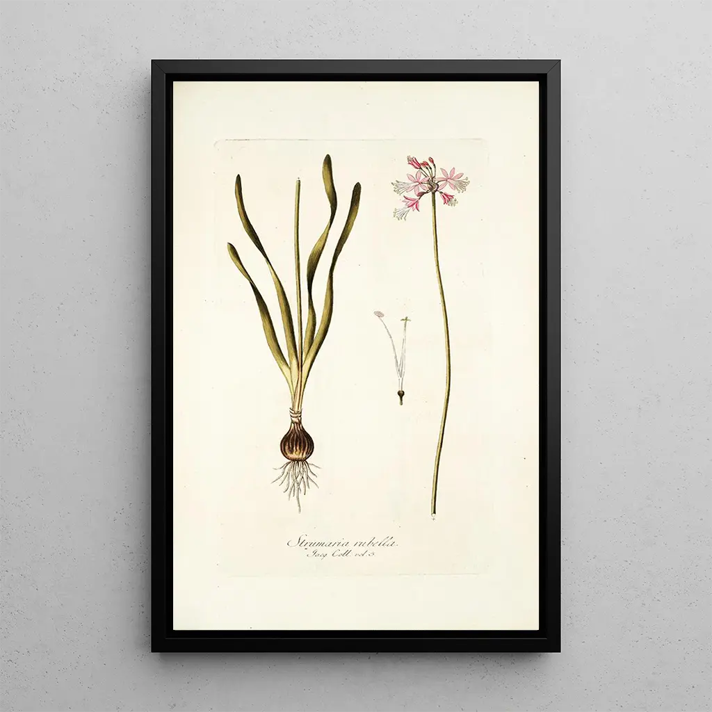 Strumaria rubella: a delicate floral harmony The art print of Strumaria rubella immerses us in a botanical universe where the delicacy of shapes and colors intertwines gracefully. The petals, in a soft pink, seem to bloom under the light, while the green shades of the leaves add a touch of freshness. The watercolor technique, chosen by the artist, gives this piece a light and airy atmosphere, almost ephemeral. Every detail is carefully rendered, inviting the viewer to come closer and admire the meticulous craftsmanship. This canvas is a true ode to the beauty of nature, capturing the fleeting moment of flowering. Nikolaus Joseph Freiherr von Jacquin: a pioneer of artistic botany Nikolaus Joseph Freiherr von Jacquin, botanist and artist of the 18th century, mastered the union of science and art in his works. Born in 1727 in Austria, he was influenced by the Enlightenment currents of the time, where the observation of nature played a prominent role. His travels in South America and the Caribbean allowed him to discover a rich and diverse flora, which he then transcribed with precision in his illustrations. Jacquin is recognized for his contribution to botany, but also for his unique artistic style, which combines scientific rigor with aesthetic sensitivity. His works, such as the art print of Strumaria rubella, testify to the importance of nature in the art of his era. A decorative acquisition with multiple assets The art print of Strumaria rubella is an ideal choice to enhance your interior, whether in a living room, office, or bedroom. Its palette of soft and soothing colors creates a serene atmosphere, conducive to relaxation. The quality of the print guarantees remarkable fidelity to the details of the original artwork, allowing you to fully enjoy the beauty of this flower. By adding this piece to your decor, you bring a touch of nature and elegance, while enriching your living space with a work of art that inspires admiration and contemplation.