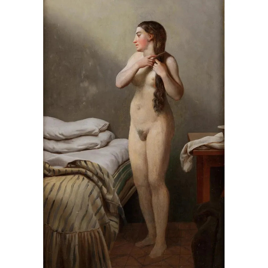 The art print "Study of a female model" by Amalia Lindegren is a striking representation of grace and feminine elegance. The composition, carefully balanced, highlights the delicate curves of the model, while soft pastel colors evoke an atmosphere of serenity. Lindegren, using oil painting techniques, manages to capture light in a way that brings her subject to life. Every detail, from facial features to the folds of clothing, is treated with meticulous care that demonstrates her skill. This art print invites deep contemplation, revealing the timeless beauty of the female body.