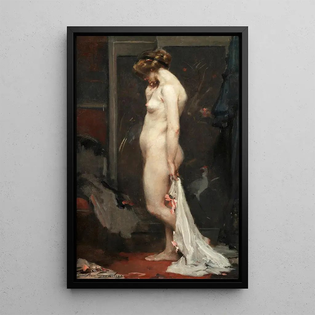 Jean Gouweloos's "Étude d'un nu" art print stands out for its delicate and sensual depiction of the human body. The graceful curves and play of light highlight the natural beauty of the model, creating an atmosphere that is both intimate and contemplative. The subtly nuanced color palette accentuates the forms and shadows, while Gouweloos's technique, blending realism and impressionism, gives the canvas a striking depth. This art print is not merely a stylistic exercise but a true celebration of human beauty in all its diversity.