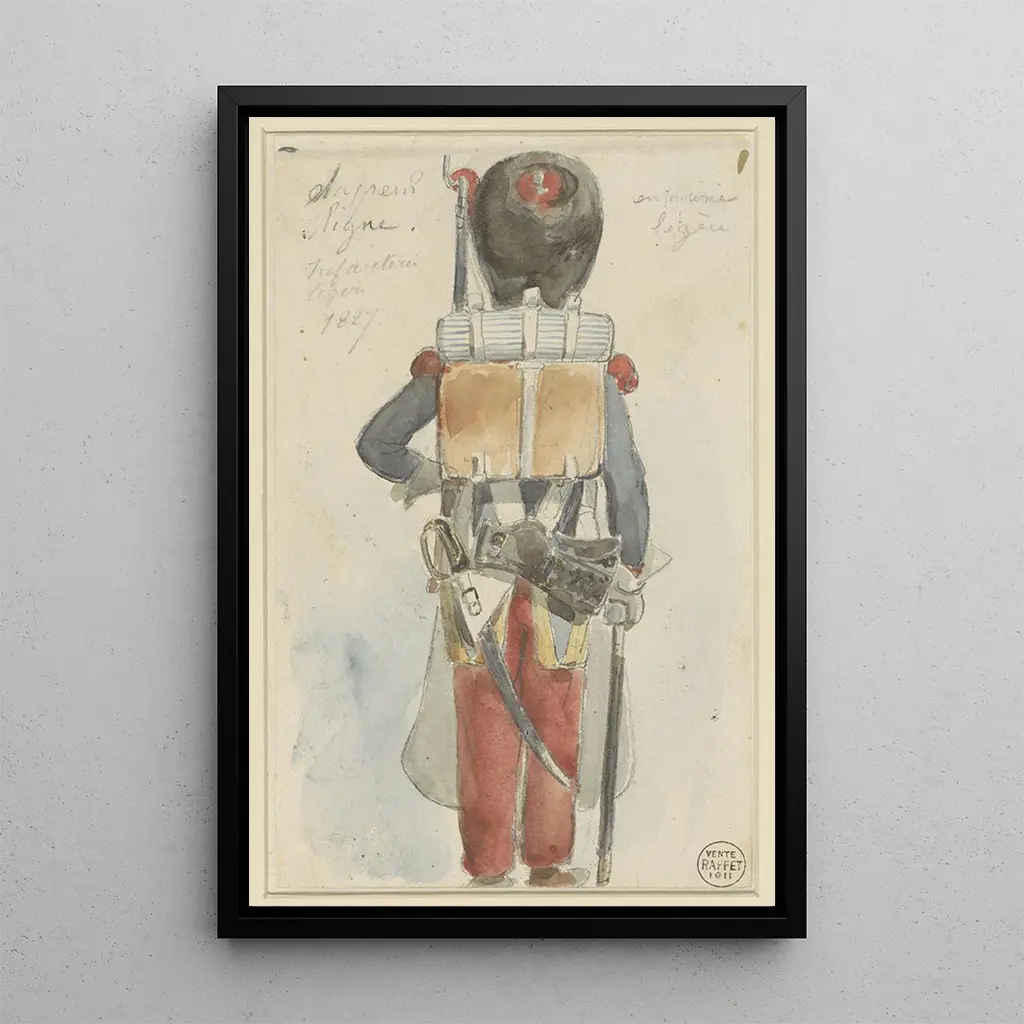 Uniform Study: A Tribute to Military Discipline The artwork "Uniform Study" by Denis Auguste Marie Raffet delicately illustrates the rigor and nobility of the military uniform. Through precise brushstrokes, the artist captures the intricate details of fabrics and ornaments, creating an atmosphere that is both solemn and dynamic. The colors, ranging from dark tones to vibrant shades, evoke the bravery and dedication of soldiers. This canvas, rich in textures and contrasts, invites the viewer to immerse themselves in a universe where honor and tradition meet. Denis Auguste Marie Raffet: a master of drawing and engraving Denis Auguste Marie Raffet, active in the 19th century, is renowned for his exceptional talent in drawing and engraving. Influenced by Romanticism, he skillfully captured the military spirit of his era, notably through his depictions of battles and soldiers. Raffet was also an active member of the Barbizon School, where he developed a unique style blending realism and idealization. His art print "Uniform Study" reflects his commitment to immortalizing military life, making him a prominent figure in 19th-century French art. A decorative piece with multiple assets The art print of "Uniform Study" is an ideal decorative item to enhance your interior, whether in a living room, office, or bedroom. Its print quality ensures remarkable fidelity to the details of the original artwork, while adding a touch of elegance to your decor. This painting, with its undeniable aesthetic appeal, sparks conversations and draws attention, transforming each space into a place of culture and history. Treat yourself to this canvas to celebrate the military and artistic heritage of our past.