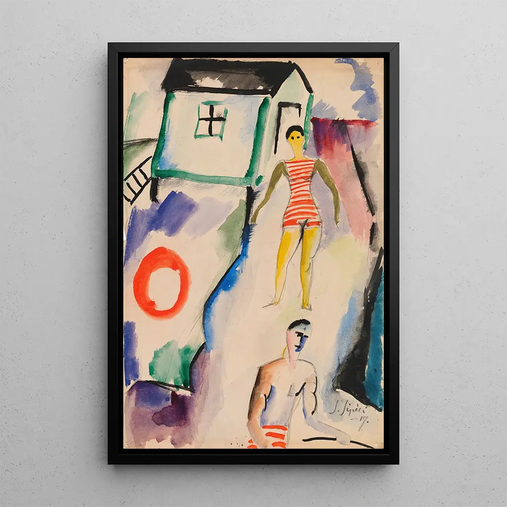 The art print of the work Beach by Sulho Sipilä captures the essence of a sunny day by the sea. The golden hues of the sand blend with the deep blues of the water, creating a striking contrast that draws the eye. Sipilä's technique, characterized by fluid and expressive brushstrokes, brings this seaside scene to life, where the movement of the waves seems almost tangible. Each element, from the umbrellas to the silhouettes of bathers, contributes to a joyful and lively atmosphere, inviting the viewer to feel the warmth of the sun and the gentle sound of the waves.